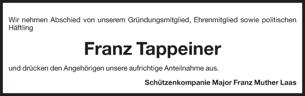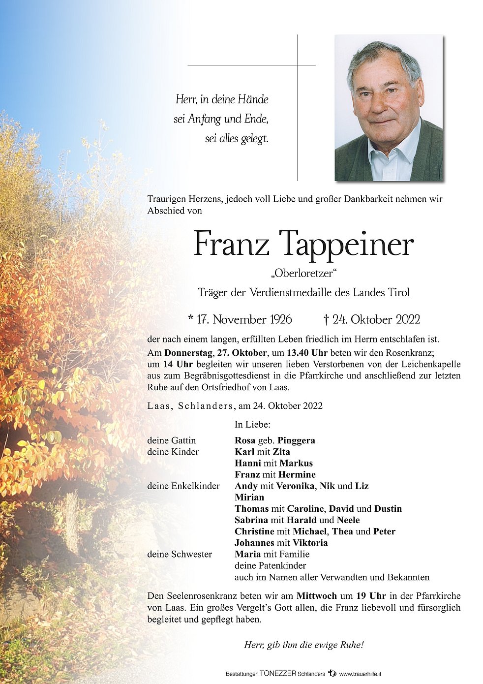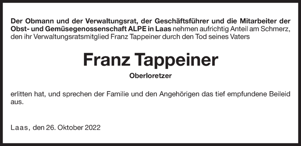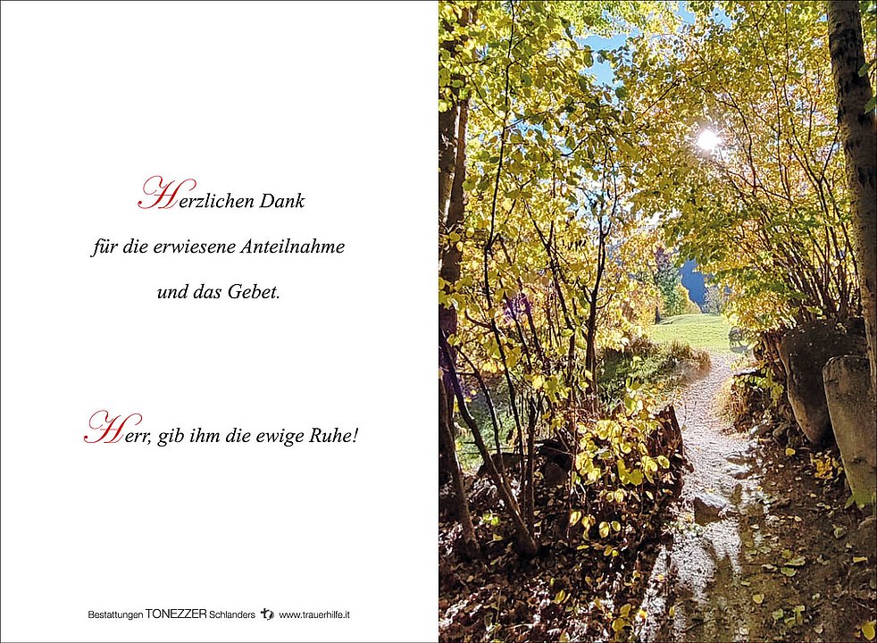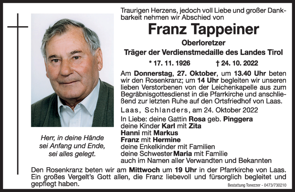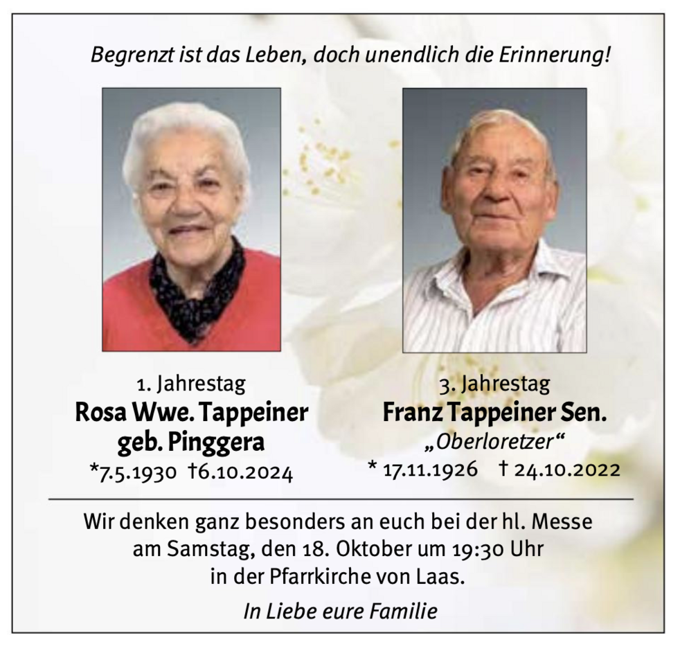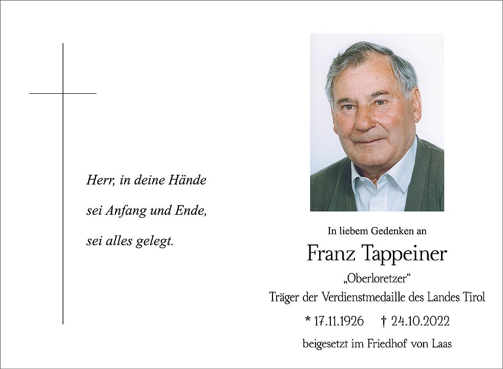 Am Donnerstag, 27. Oktober, um 13.40 Uhr beten wir den Rosenkranz; um 14 Uhr begleiten wir unseren lieben Verstorbenen von der Leichenkapelle aus zum Begräbnisgottesdienst in die Pfarrkirche und anschließend zur letzten Ruhe auf den Ortsfriedhof von Laas.