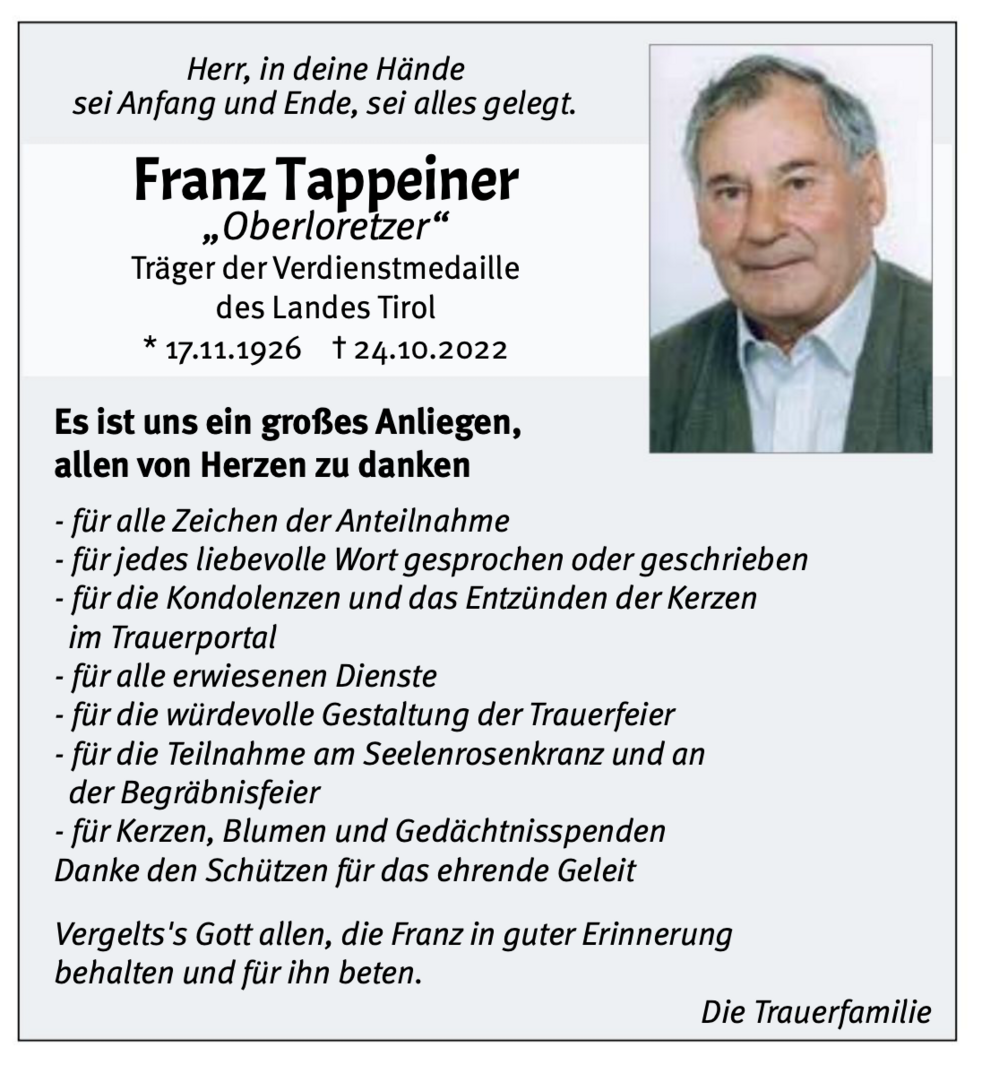 Ein großes Vergelt’s Gott allen, die Franz liebevoll und fürsorglich begleitet und gepflegt haben.