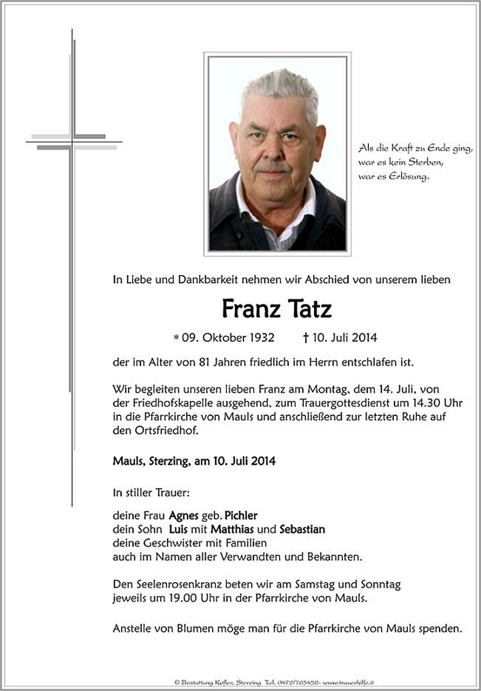Anstelle von Blumen möge man für die Pfarrkirche von Mauls spenden.