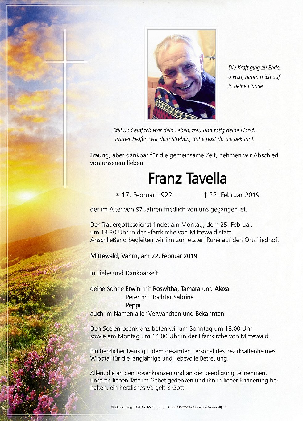 Der Trauergottesdienst findet am Montag, dem 25. Februar, um 14.30 Uhr in der Pfarrkirche von Mittewald statt. Anschließend begleiten wir ihn zur letzten Ruhe auf den Ortsfriedhof.