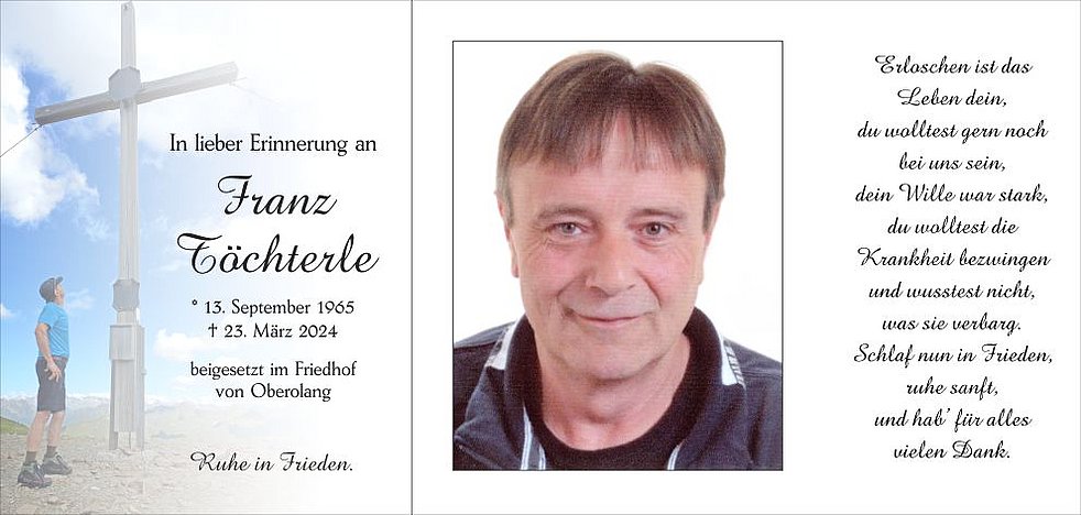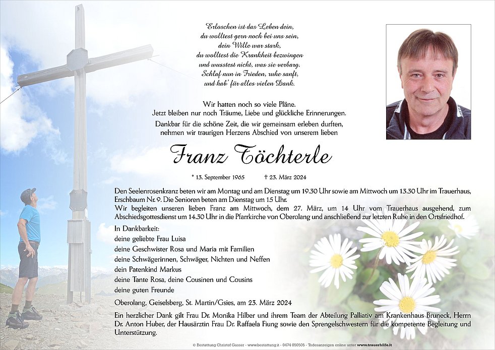 Wir begleiten unseren lieben Franz am Mittwoch, dem 27. März, um 14 Uhr vom Trauerhaus ausgehend, zum Abschiedsgottesdienst um 14.30 Uhr in die Pfarrkirche von Oberolang und anschließend zur letzten Ruhe in den Ortsfriedhof.
