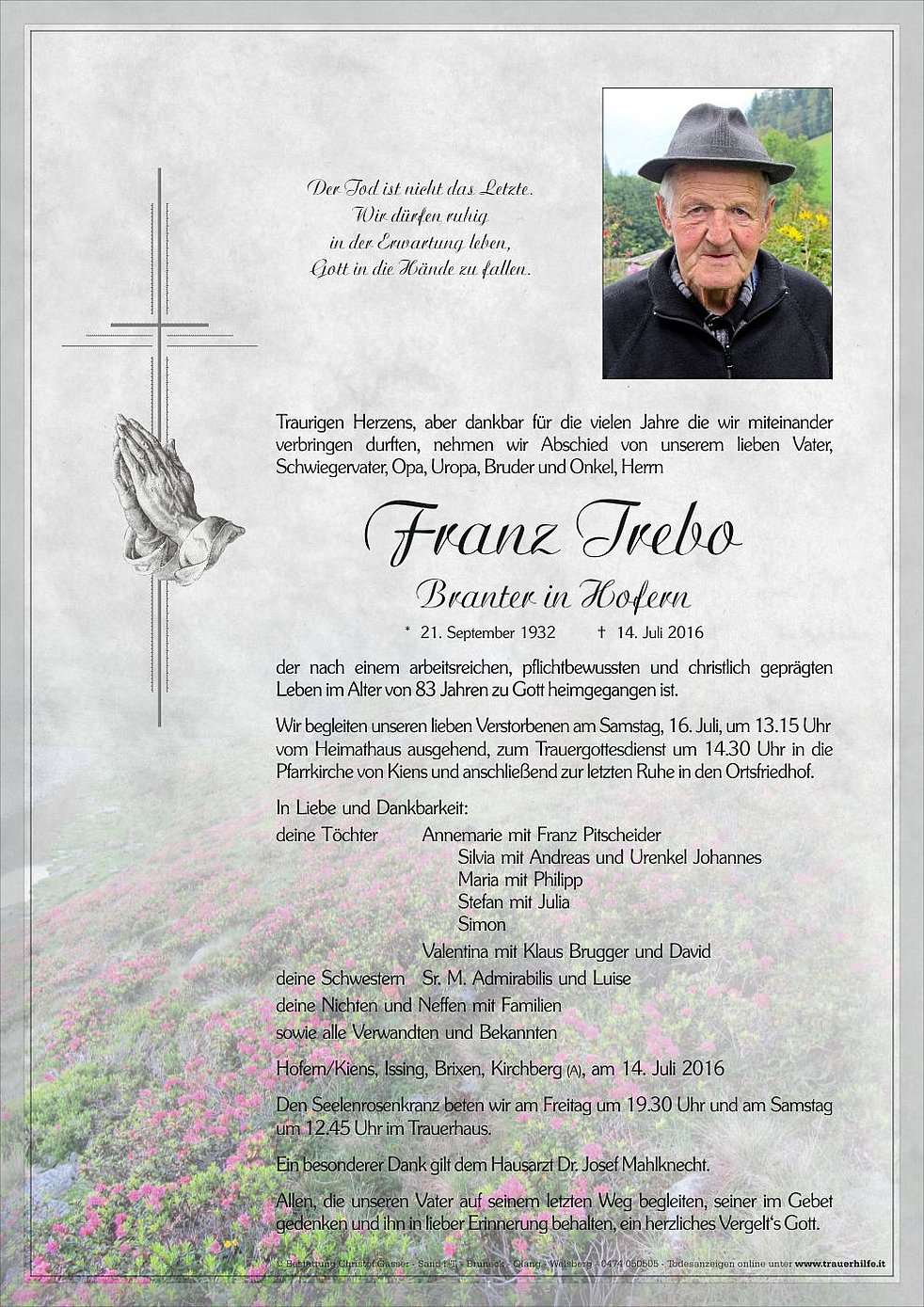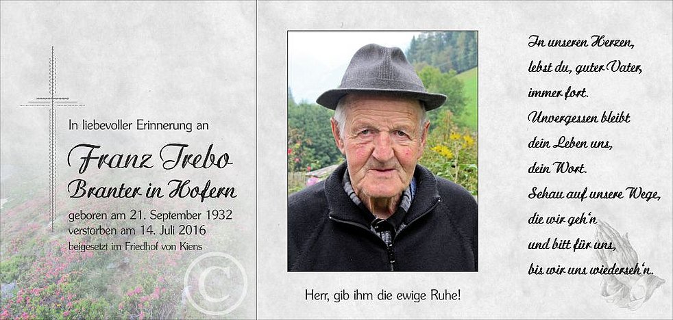 Wir begleiten unseren lieben Verstorbenen am Samstag, 16. Juli, um 13.15 Uhr vom Heimathaus ausgehend, zum Trauergottesdienst um 14.30 Uhr in die Pfarrkirche von Kiens und anschließend zur letzten Ruhe in den Ortsfriedhof.