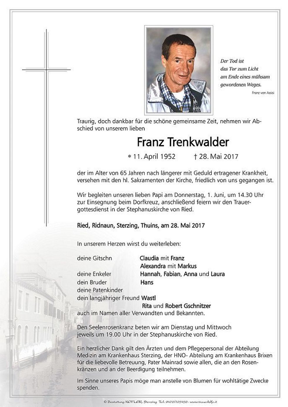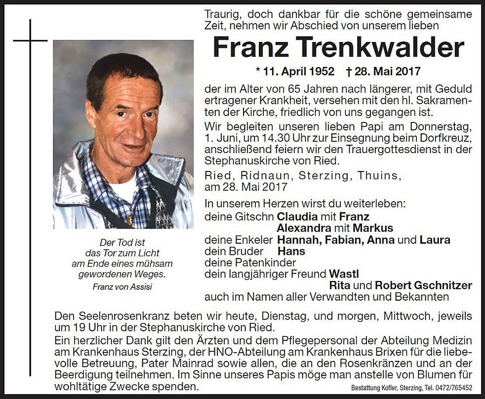 Ein herzlicher Dank gilt den Ärzten und dem Pflegepersonal der Abteilung Medizin am Krankenhaus Sterzing, der HNO- Abteilung am Krankenhaus Brixen für die liebevolle Betreuung, Pater Mainrad sowie allen, die an den Rosenkränzen und an der Beerdigung teilnehmen.