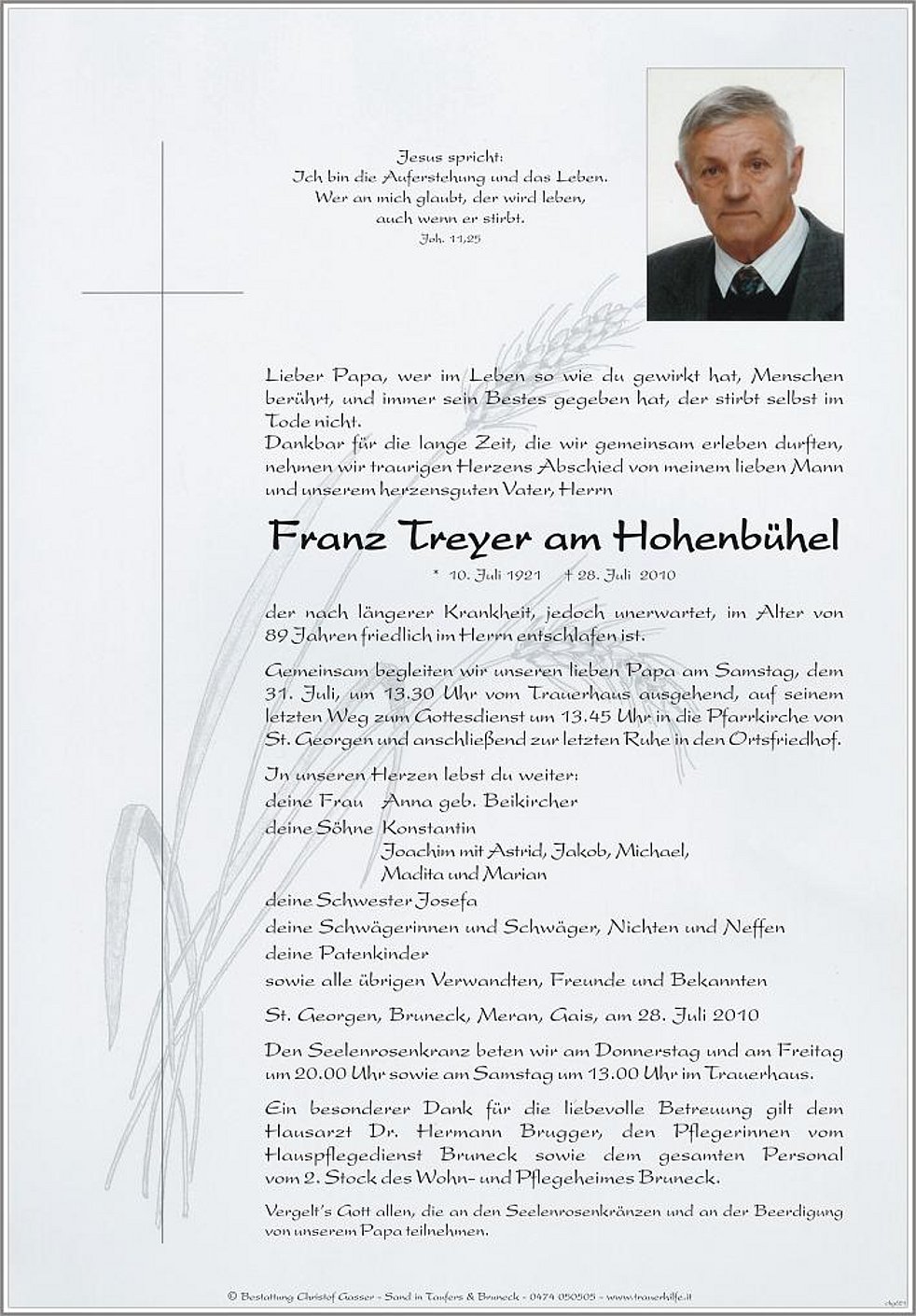 Gemeinsam begleiten wir unseren lieben Papa am Samstag, dem 31. Juli, um 13.30 Uhr vom Trauerhaus ausgehend, auf seinem letzten Weg zum Gottesdienst um 13.45 Uhr in die Pfarrkirche von St. Georgen und anschließend zur letzten Ruhe in den Ortsfriedhof.