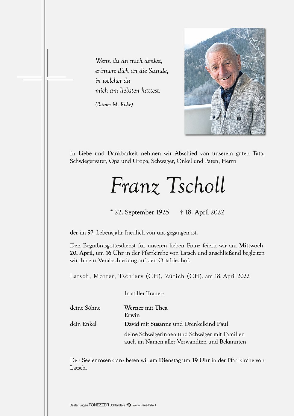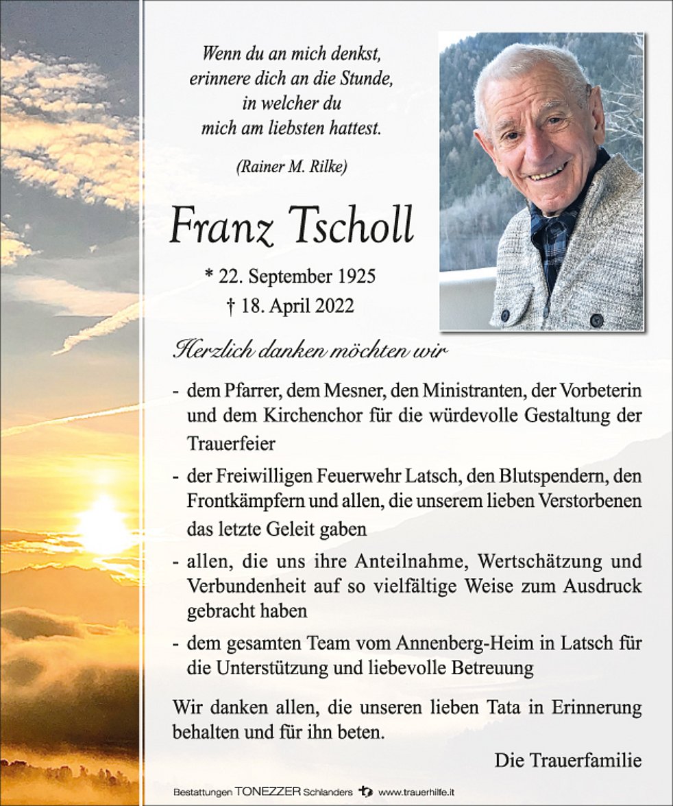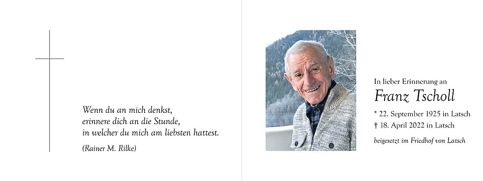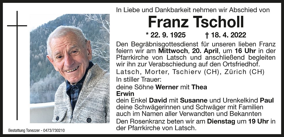 Den Begräbnisgottesdienst für unseren lieben Franz feiern wir am Mittwoch, 20. April, um 16 Uhr in der Pfarrkirche von Latsch und anschließend begleiten wir ihn zur Verabschiedung auf den Ortsfriedhof.