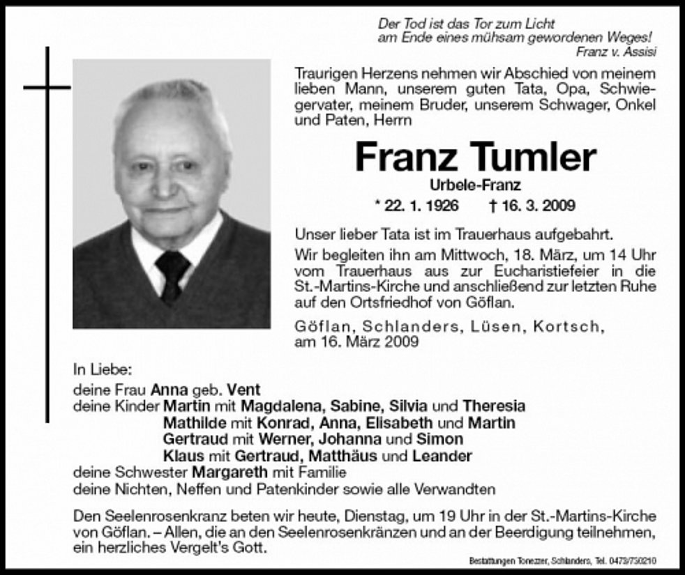 Wir begleiten ihn am Mittwoch, 18. März, um 14 Uhr vom Trauerhaus aus zur Eucharistiefeier in die St.Martins-Kirche und anschließend zur letzten Ruhe auf den Ortsfriedhof von Göflan.