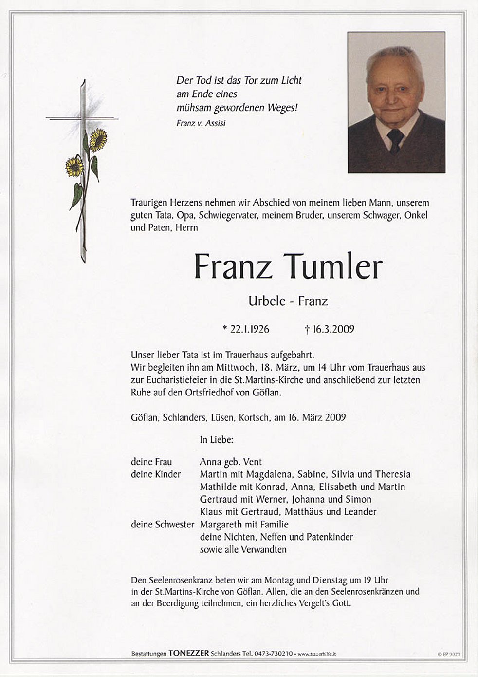 Allen, die an den Seelenrosenkränzen und an der Beerdigung teilnehmen, ein herzliches Vergelt’s Gott.