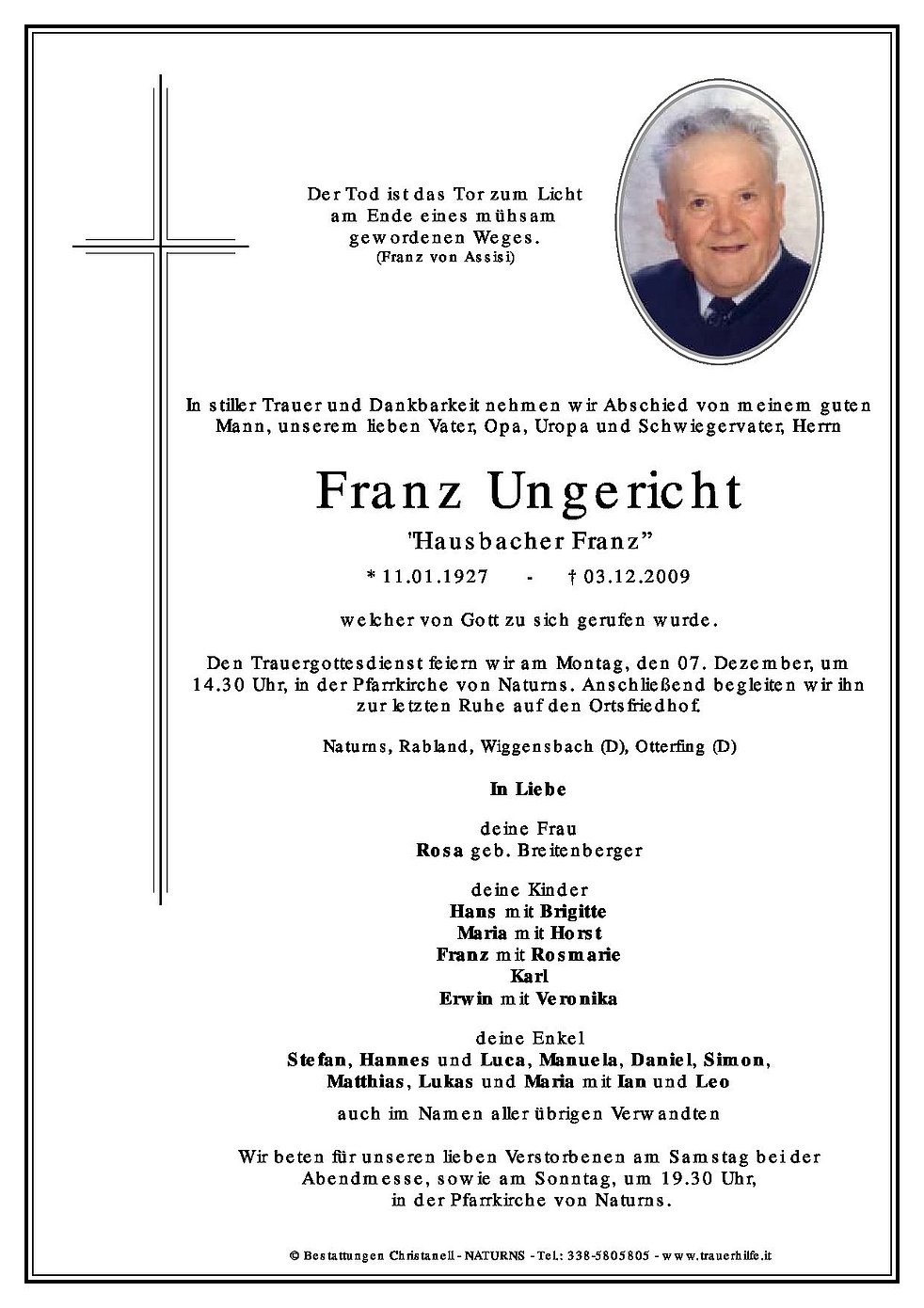 Den Trauergottesdienst feiern wir am Montag, den 07. Dezember, um 14.30 Uhr, in der Pfarrkirche von Naturns. Anschließend begleiten wir ihn zur letzten Ruhe auf den Ortsfriedhof.
