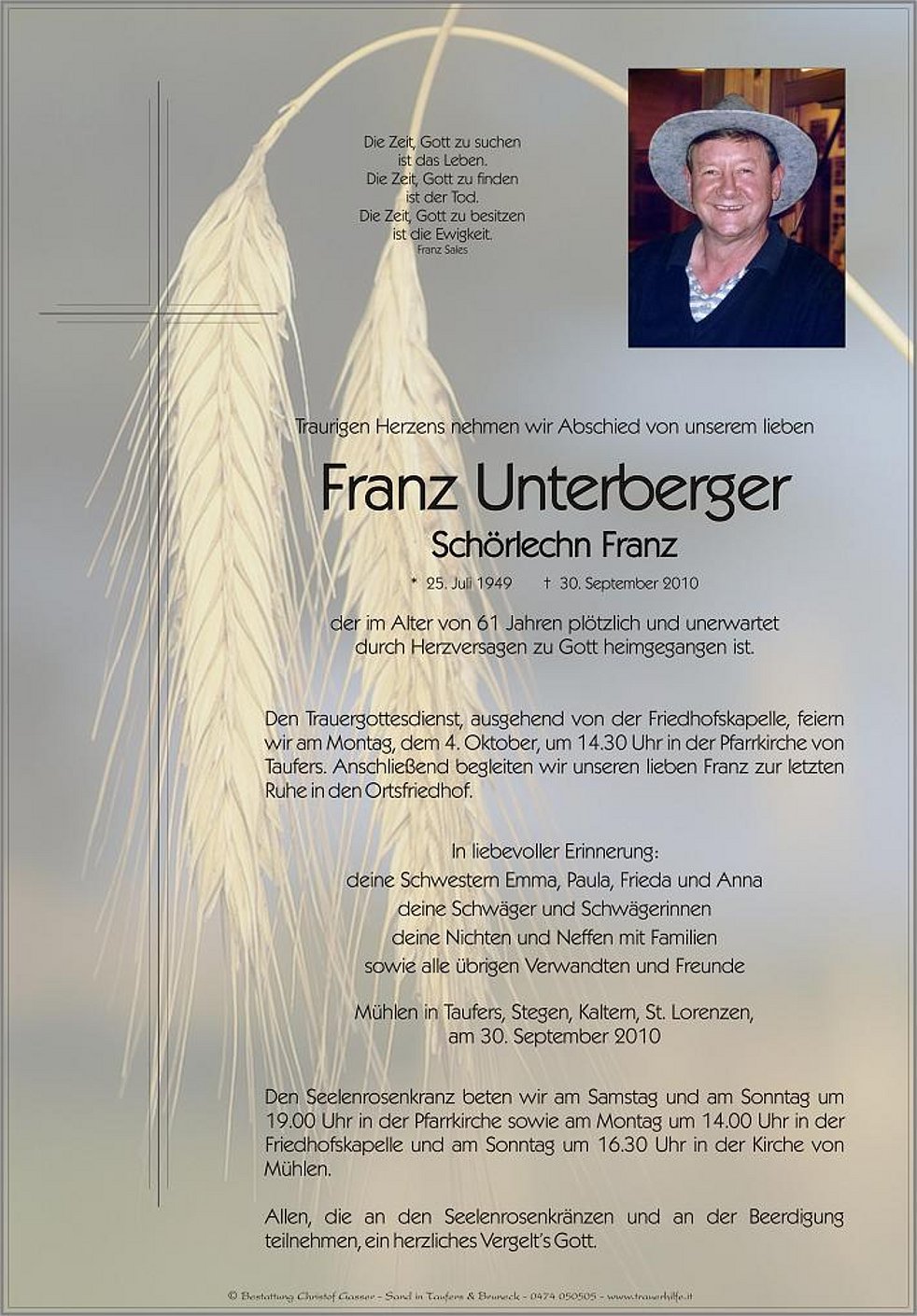 Den Trauergottesdienst, ausgehend von der Friedhofskapelle, feiern wir am Montag, dem 4. Oktober, um 14.30 Uhr in der Pfarrkirche von Taufers. Anschließend begleiten wir unseren lieben Franz zur letzten Ruhe in den Ortsfriedhof.