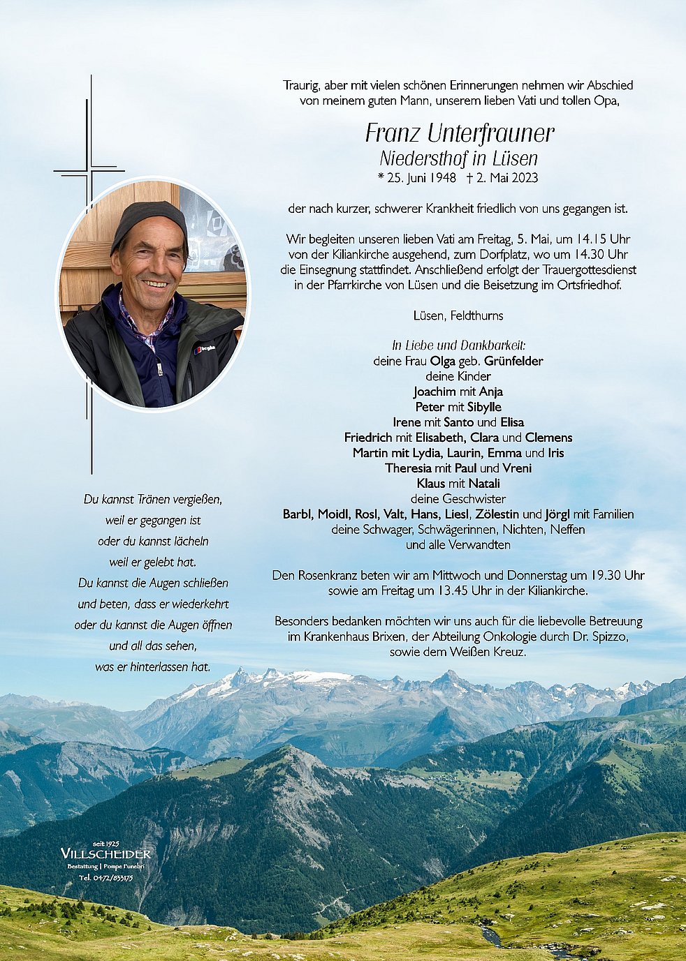 Lieaba Franz du worsch vu ins olm a guata Nochbor du worsch olm do wenn ma die gebraucht hom vergeltsgott fűr ols in deina Familie wűnsch ma gonz viel Kroft und viel Gottessegn guata Reise