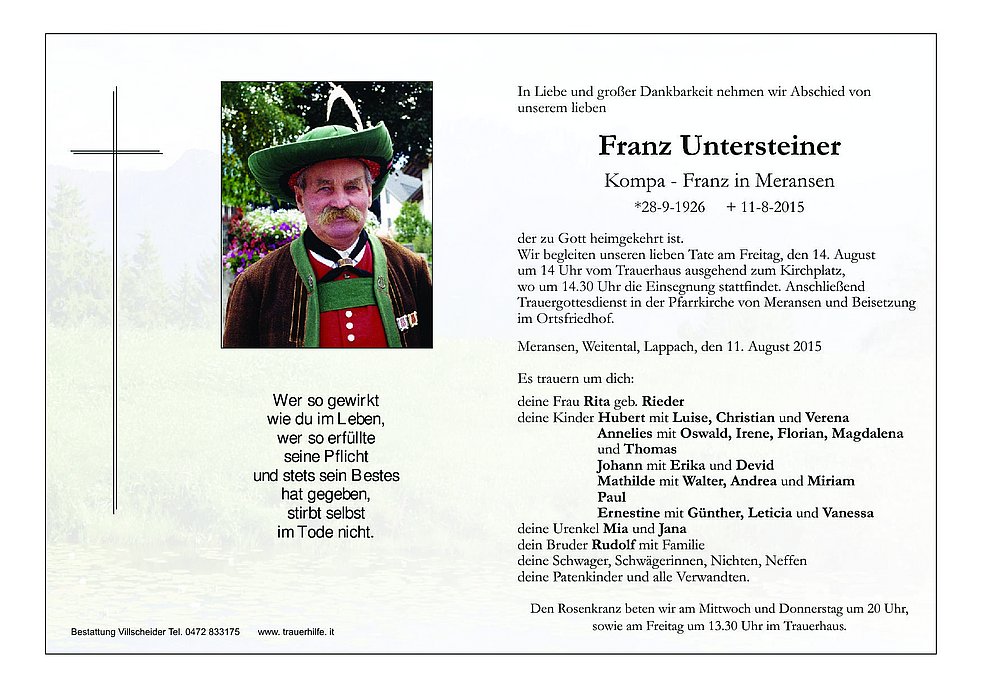 wo um 14.30 Uhr die Einsegnung stattfindet. Anschließend Trauergottesdienst in der Pfarrkirche von Meransen und Beisetzung im Ortsfriedhof.