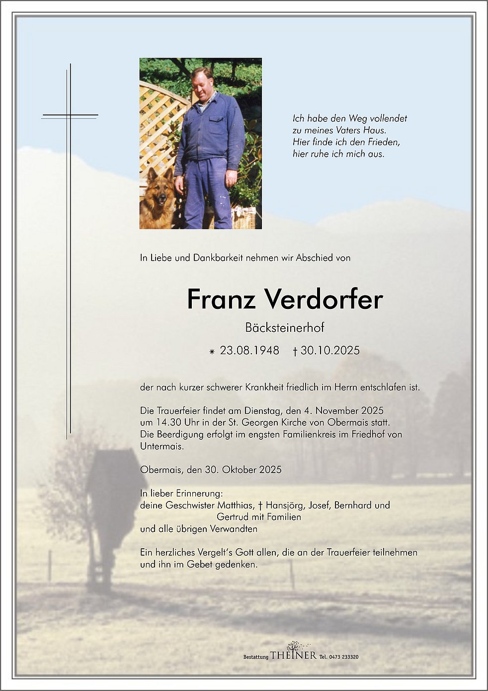 Die Trauerfeier findet am Dienstag, den 4. November 2025 um 14.30 Uhr in der St. Georgen Kirche von Obermais statt.