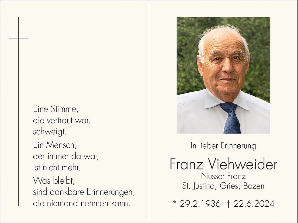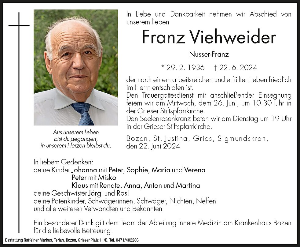 Den Trauergottesdienst mit anschließender Einsegnung feiern wir am Mittwoch, dem 26. Juni, um 10.30 Uhr in der Grieser Stiftspfarrkirche.