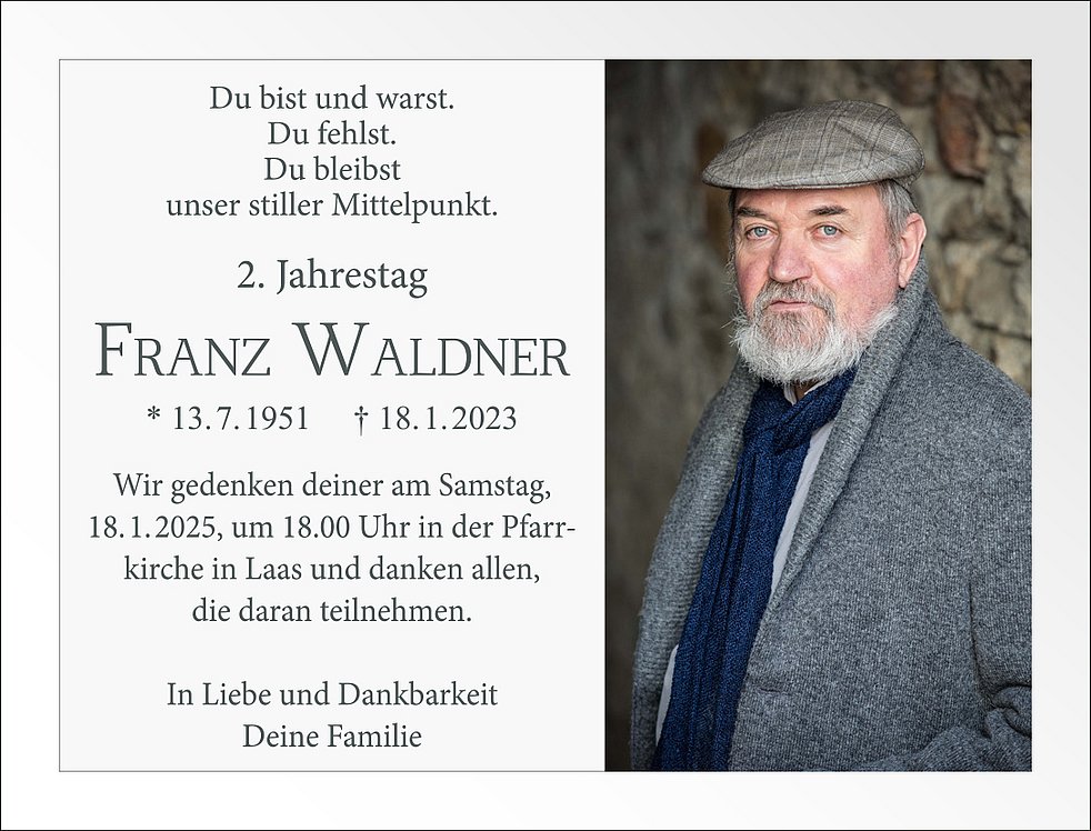 Am Samstag, 21. Jänner, um 13.40 Uhr beten wir den Rosenkranz; um 14 Uhr begleiten wir unseren lieben Franz vom Friedhofseingang ausgehend mit Umgang durch das Dorf zum Begräbnisgottesdienst in die Pfarrkirche von Laas. Anschließend erfolgt die Beisetzung im Ortsfriedhof.