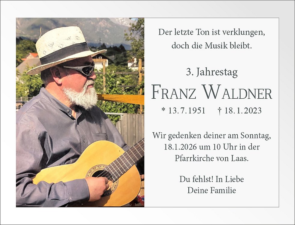 Am Samstag, 21. Jänner, um 13.40 Uhr beten wir den Rosenkranz; um 14 Uhr begleiten wir unseren lieben Franz vom Friedhofseingang ausgehend mit Umgang durch das Dorf zum Begräbnisgottesdienst in die Pfarrkirche von Laas. Anschließend erfolgt die Beisetzung im Ortsfriedhof.