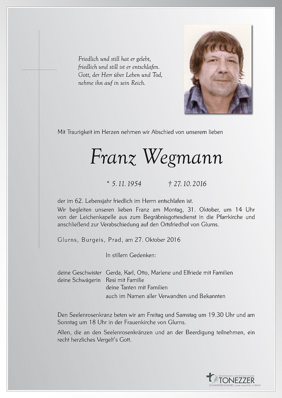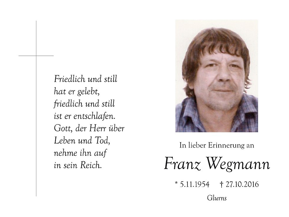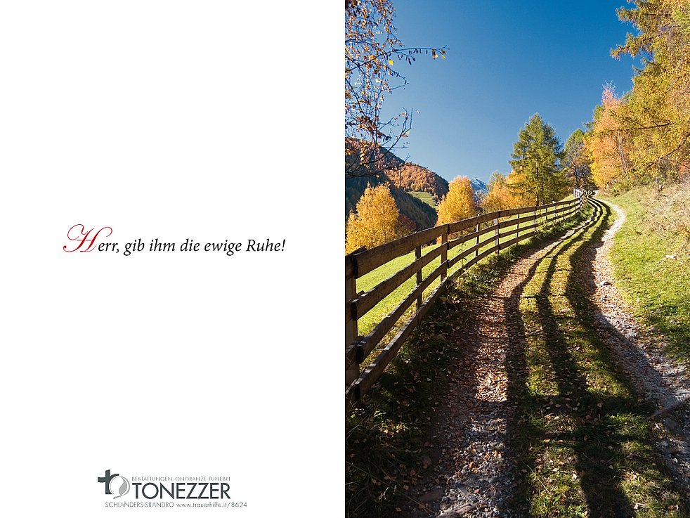 Wir begleiten unseren lieben Franz am Montag, 31. Oktober, um 14 Uhr von der Leichenkapelle aus zum Begräbnisgottesdienst in die Pfarrkirche und anschließend zur Verabschiedung auf den Ortsfriedhof von Glurns.