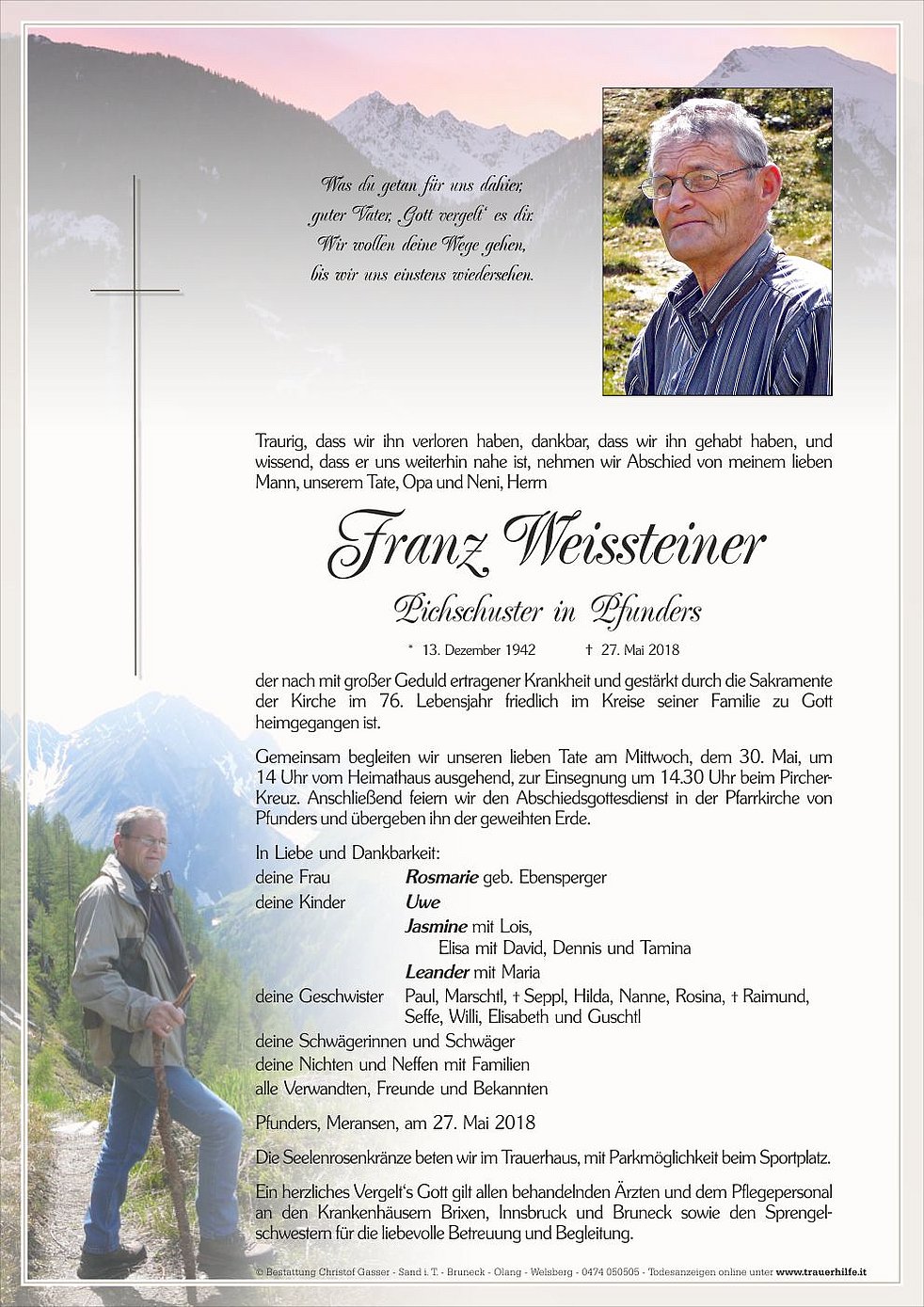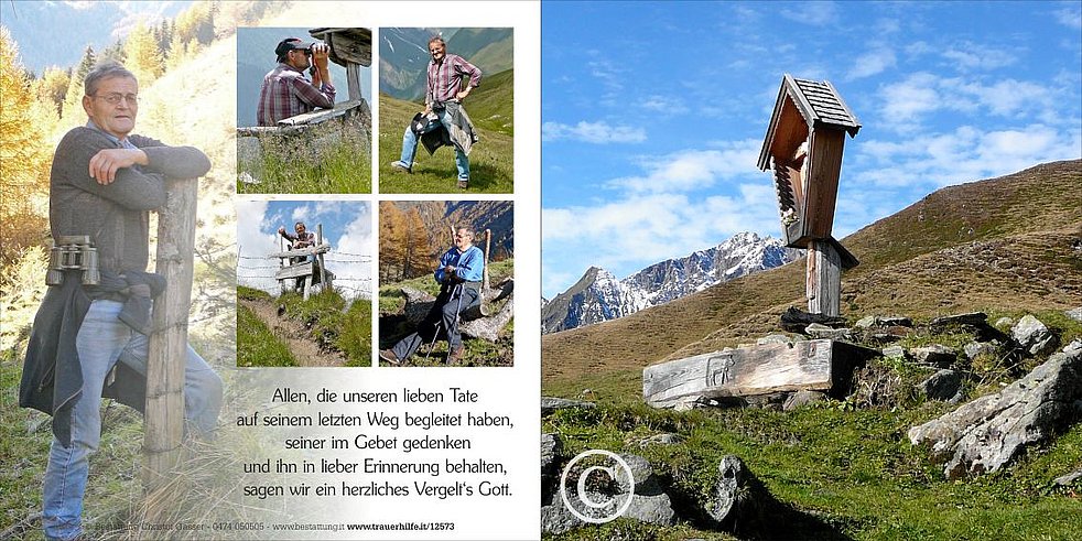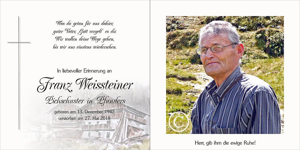 14 Uhr vom Heimathaus ausgehend, zur Einsegnung um 14.30 Uhr beim Pircher-Kreuz. Anschließend feiern wir den Abschiedsgottesdienst in der Pfarrkirche von Pfunders und übergeben ihn der geweihten Erde.
