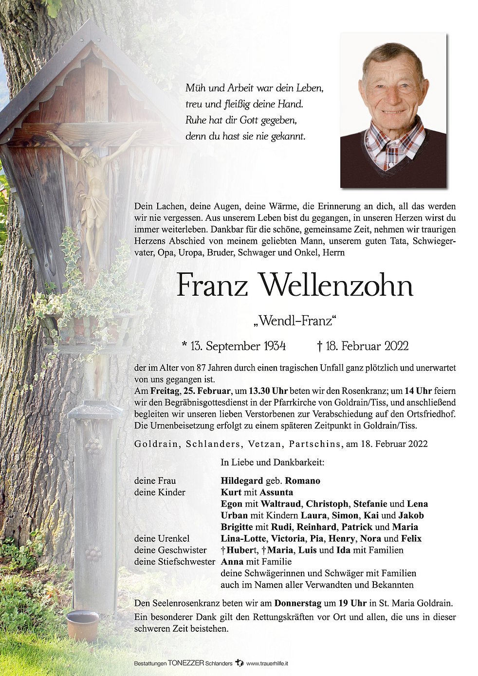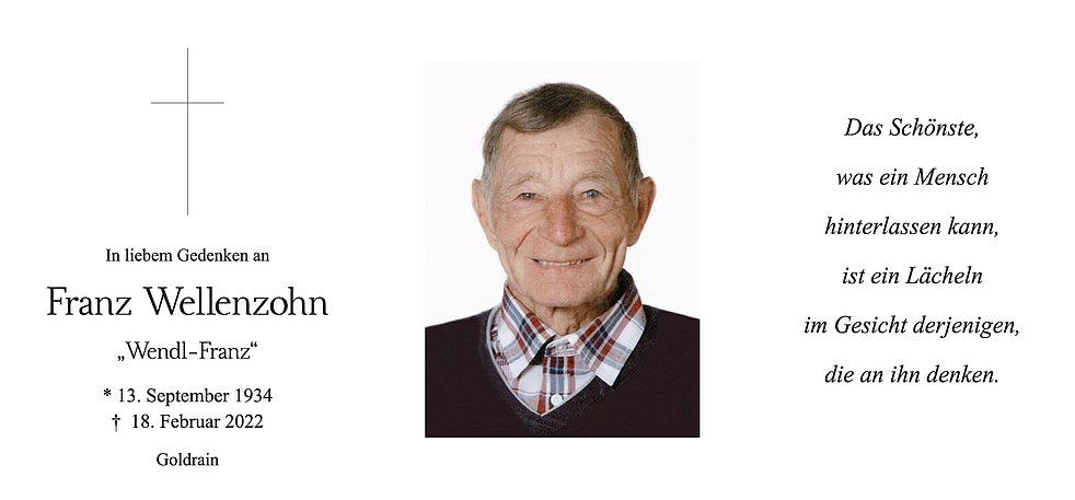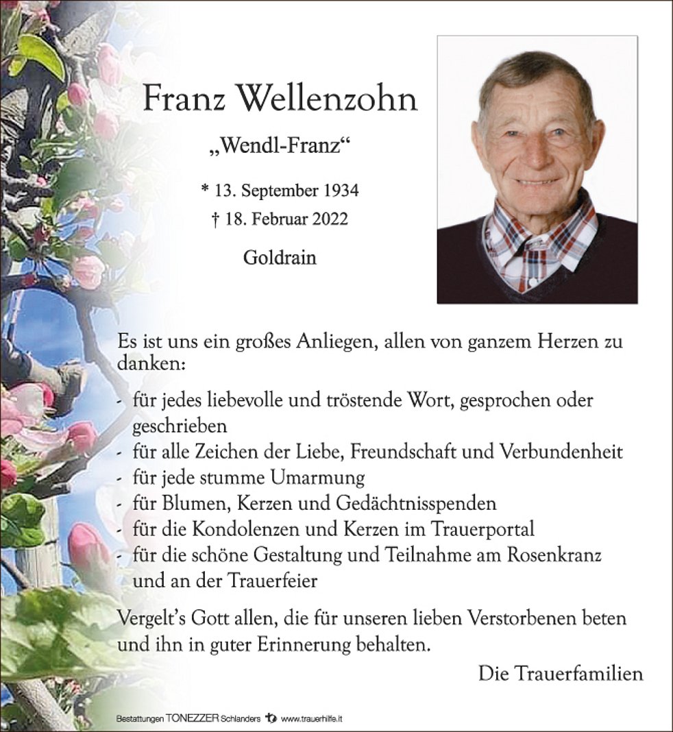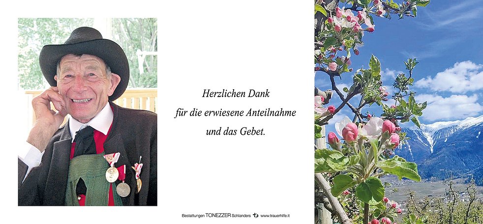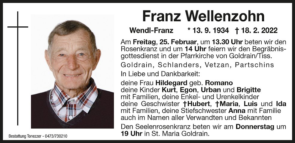 Am Freitag, 25. Februar, um 13.30 Uhr beten wir den Rosenkranz; um 14 Uhr feiern wir den Begräbnisgottesdienst in der Pfarrkirche von Goldrain/Tiss, und anschließend begleiten wir unseren lieben Verstorbenen zur Verabschiedung auf den Ortsfriedhof.