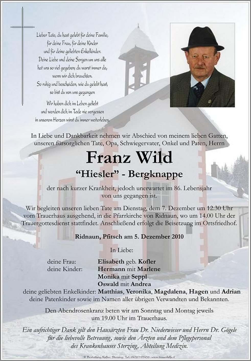 vom Trauerhaus ausgehend, in die Pfarrkirche von Ridnaun, wo um 14.00 Uhr