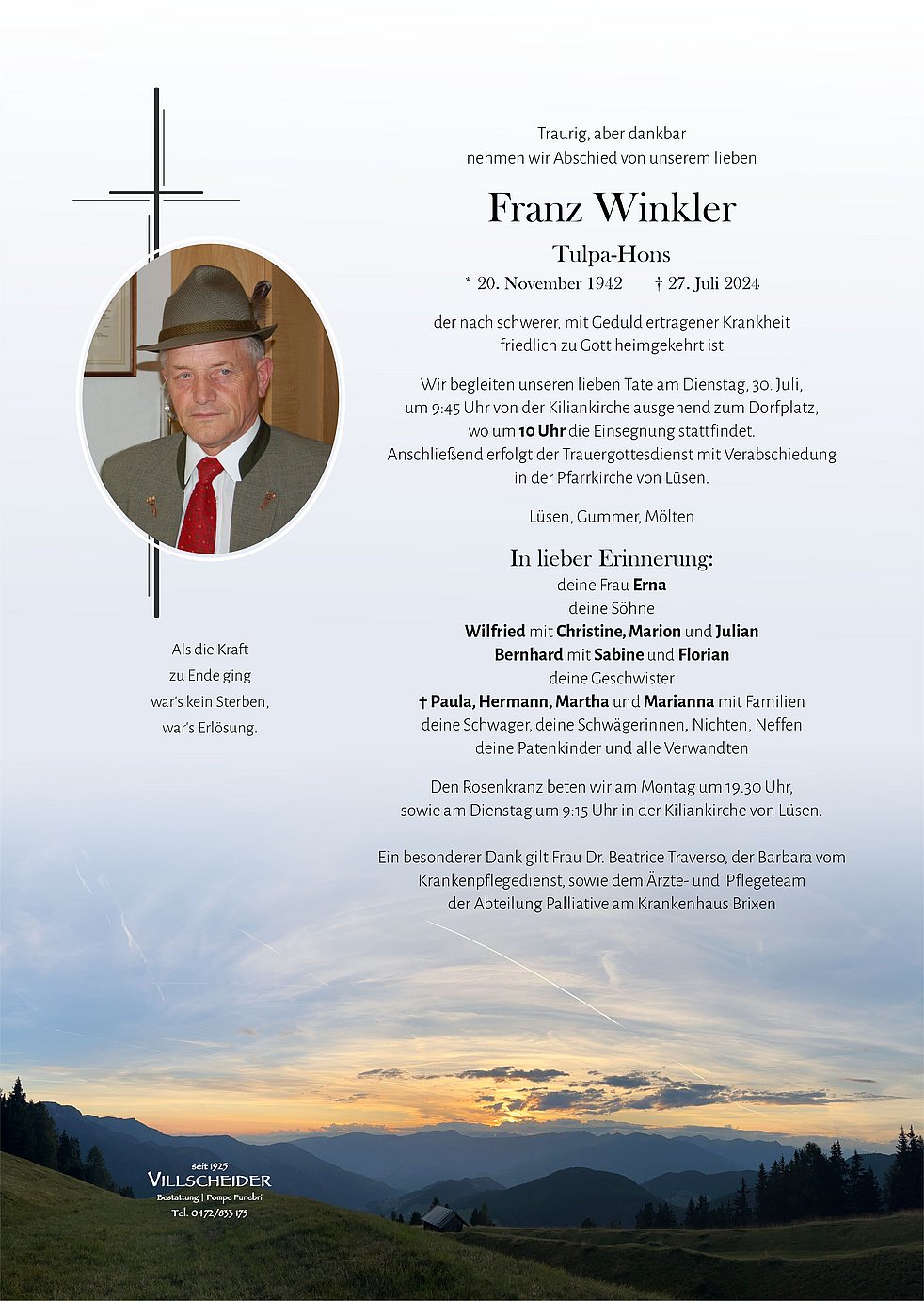 Trauerfeier: 30.07. - 10:00 Uhr Lüsen