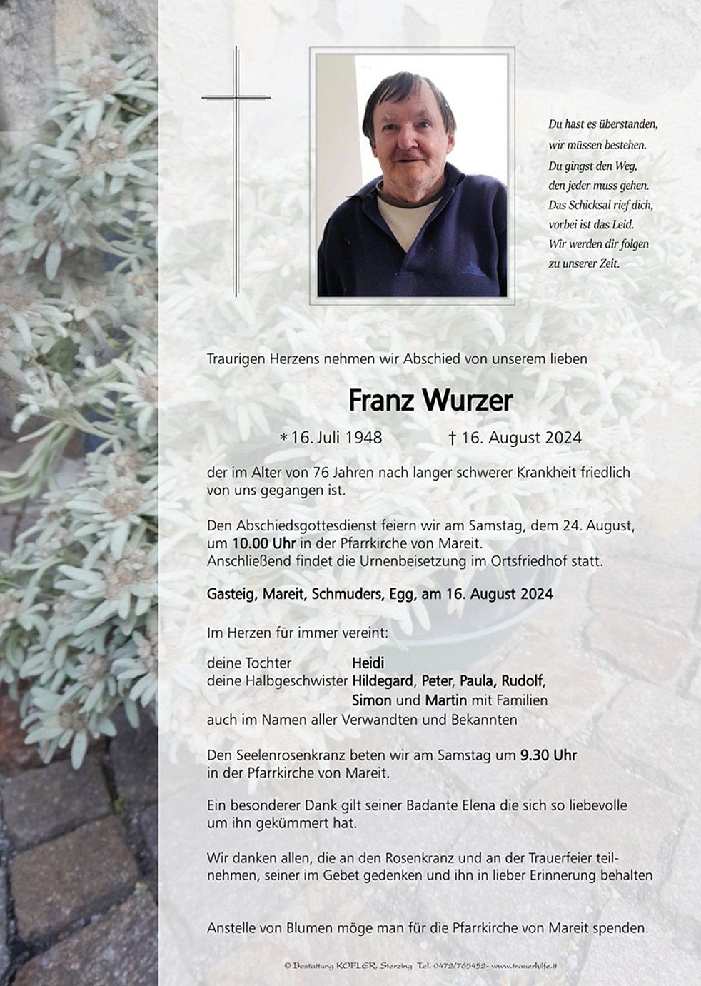 Den Abschiedsgottesdienst feiern wir am Samstag, dem 24. August, um 10.00 Uhr in der Pfarrkirche von Mareit. Anschließend findet die Urnenbeisetzung im Ortsfriedhof statt.