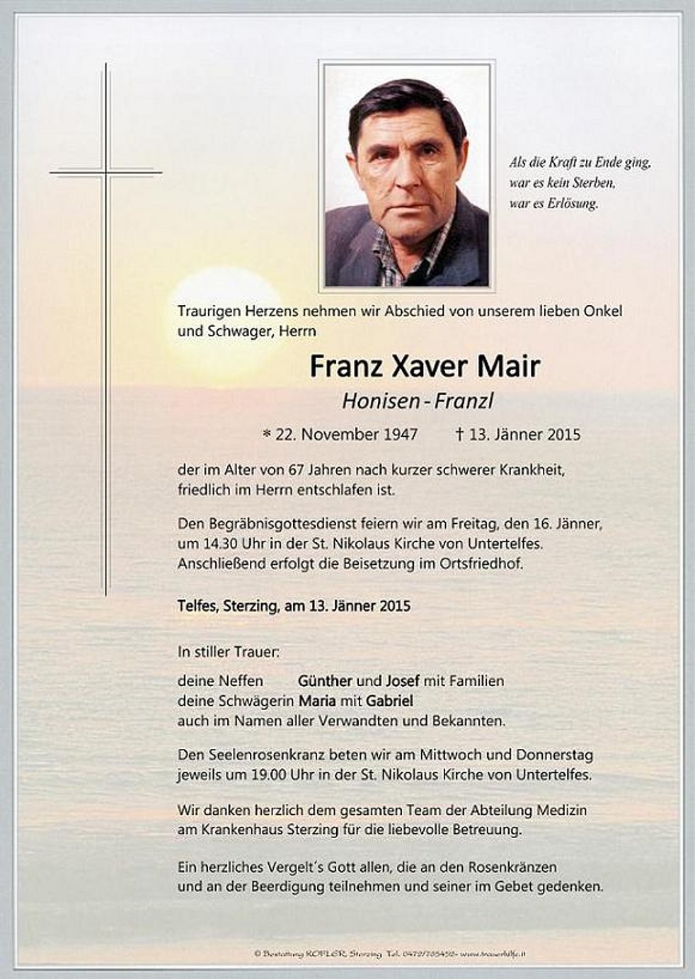 Den Begräbnisgottesdienst feiern wir am Freitag, den 16. Jänner,