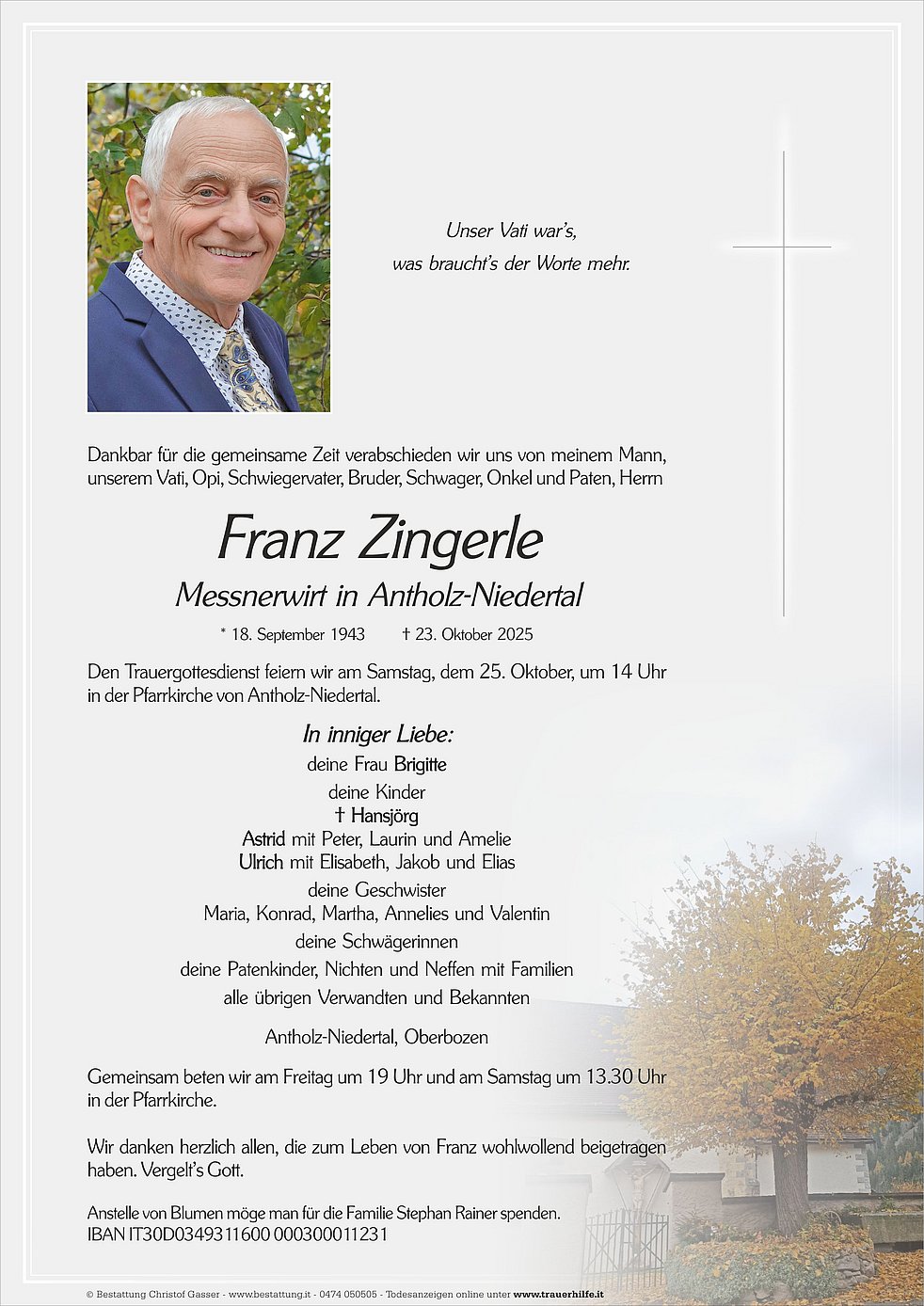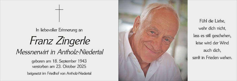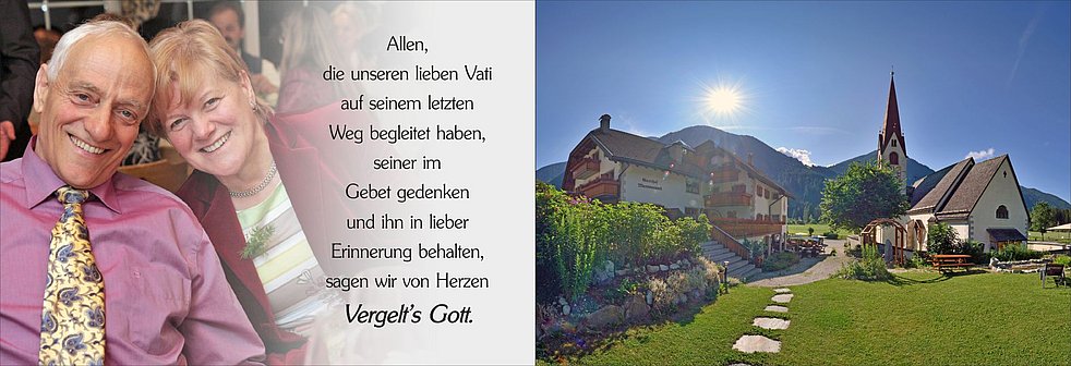 Den Trauergottesdienst feiern wir am Samstag, dem 25. Oktober, um 14 Uhr in der Pfarrkirche von Antholz-Niedertal.