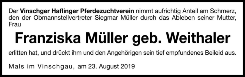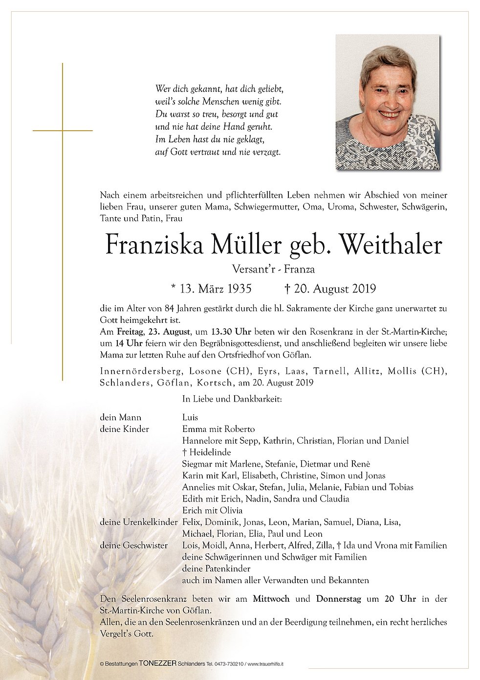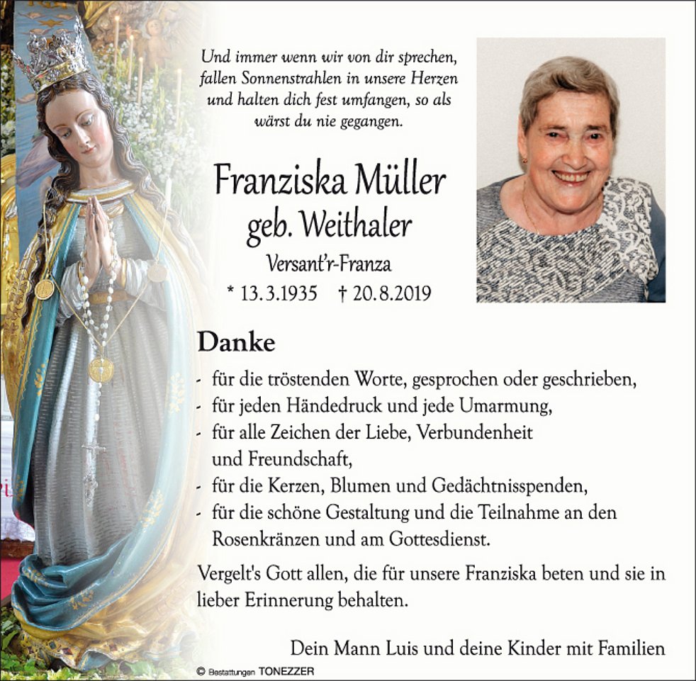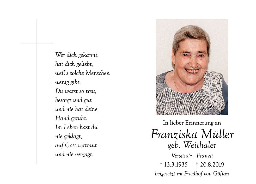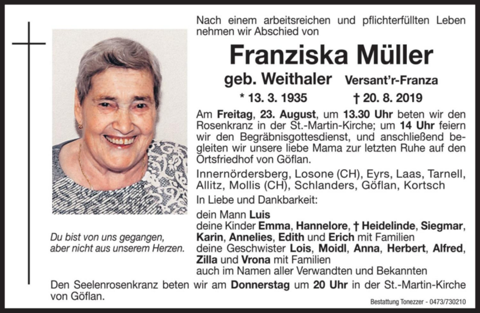 Am Freitag, 23. August, um 13.30 Uhr beten wir den Rosenkranz in der St.-Martin-Kirche; um 14 Uhr feiern wir den Begräbnisgottesdienst, und anschließend begleiten wir unsere liebe Mama zur letzten Ruhe auf den Ortsfriedhof von Göflan.