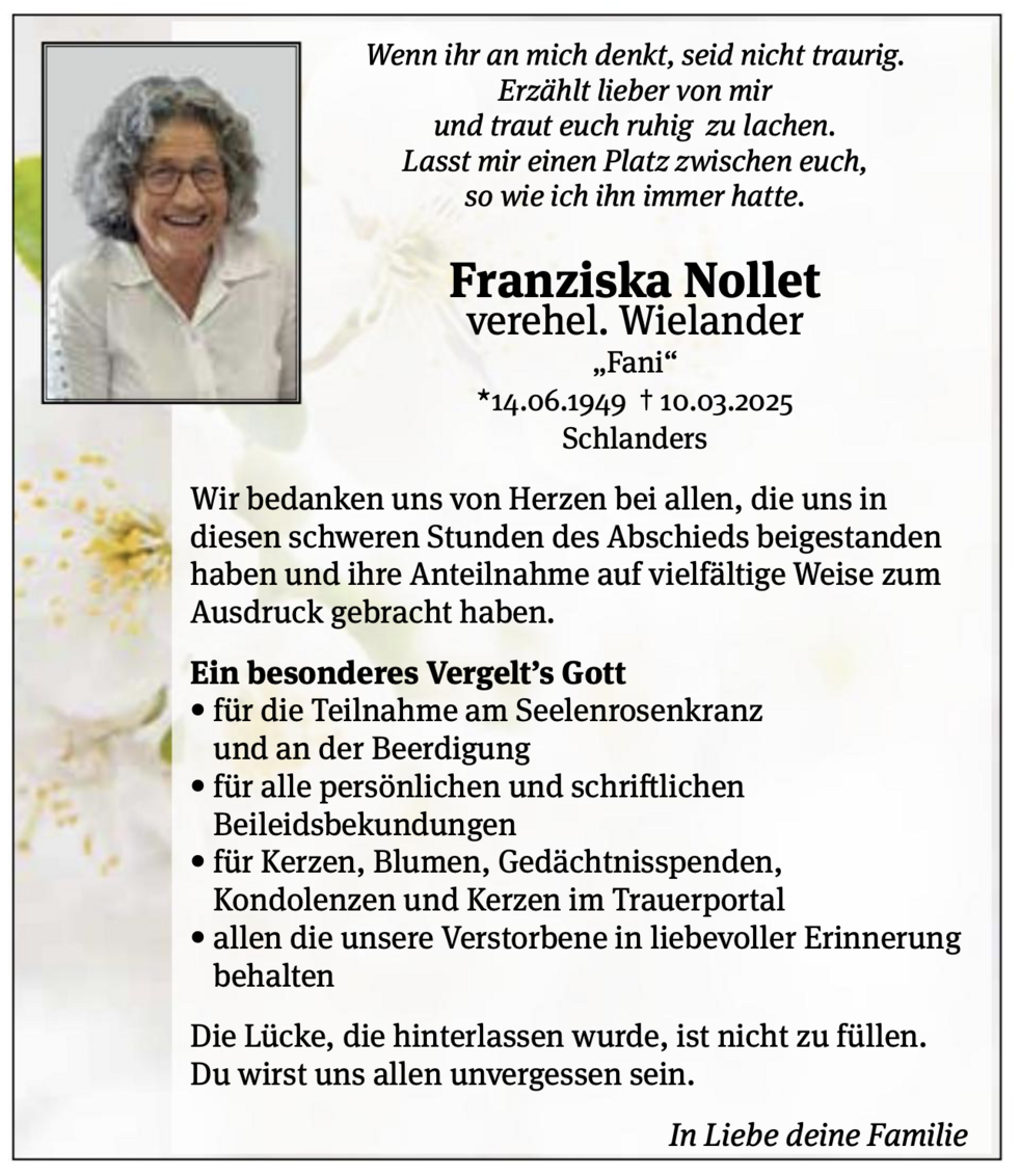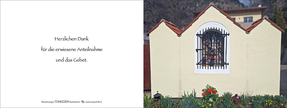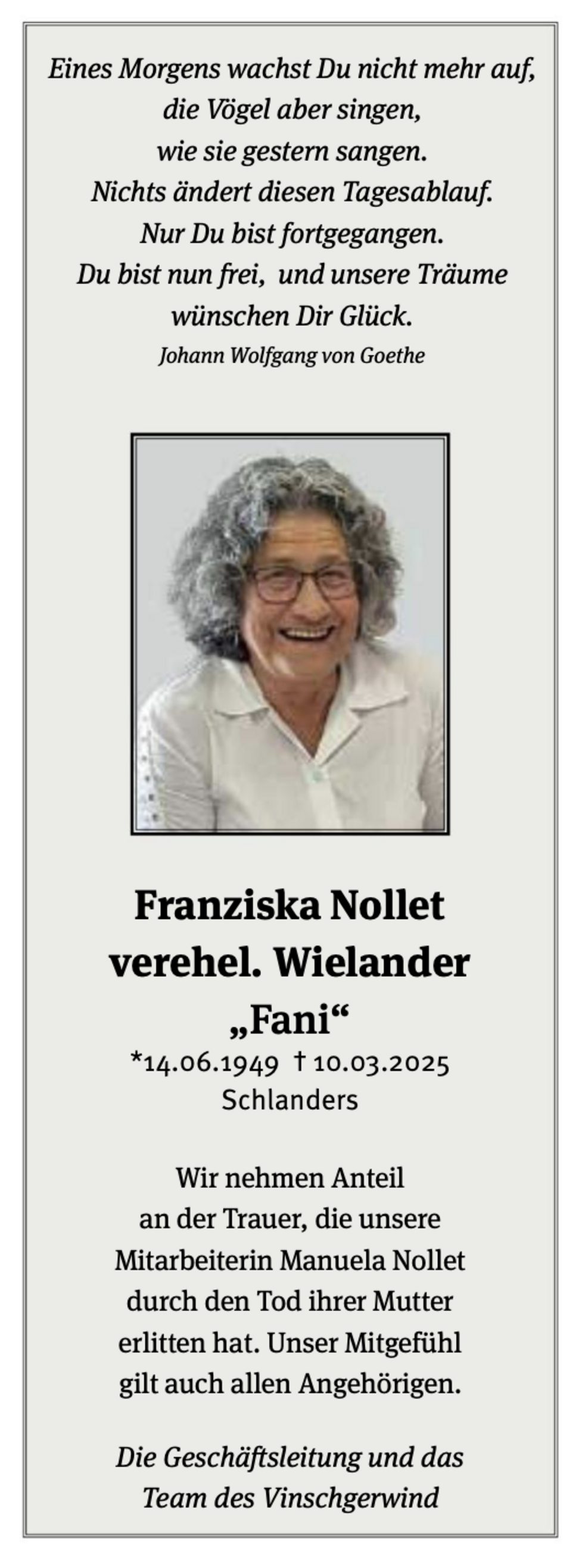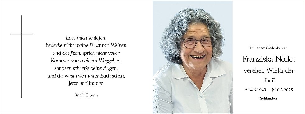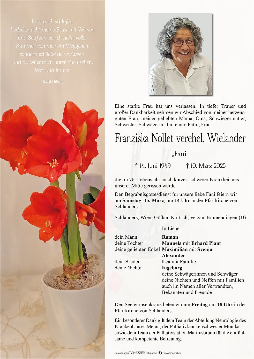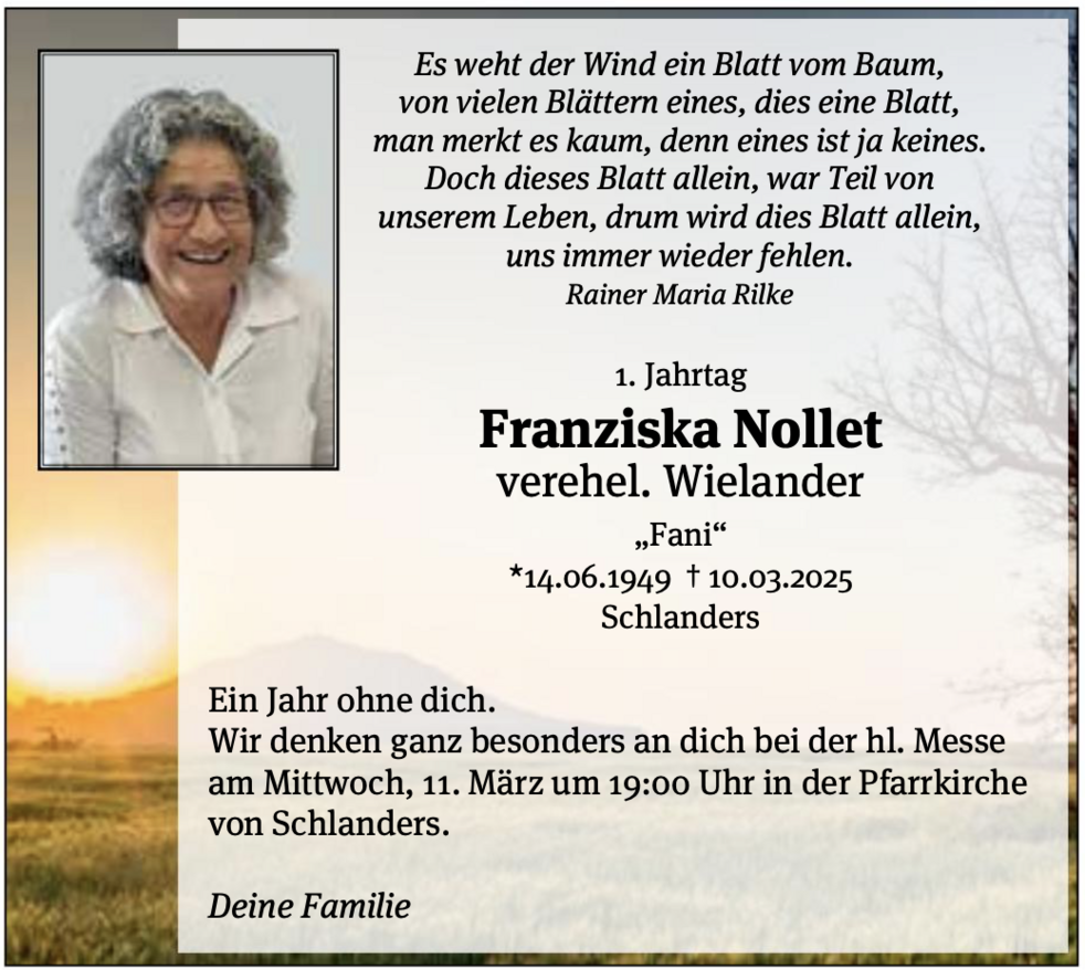 Den Begräbnisgottesdienst für unsere liebe Fani feiern wir am Samstag, 15. März, um 14 Uhr in der Pfarrkirche von Schlanders.