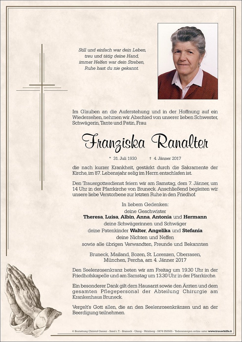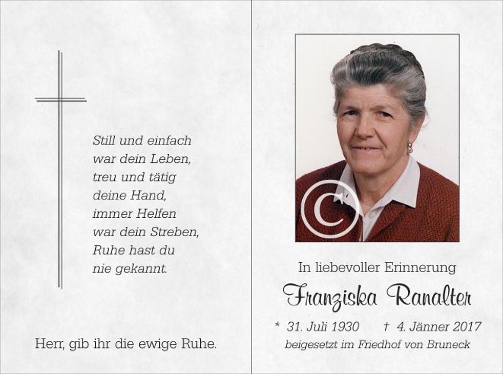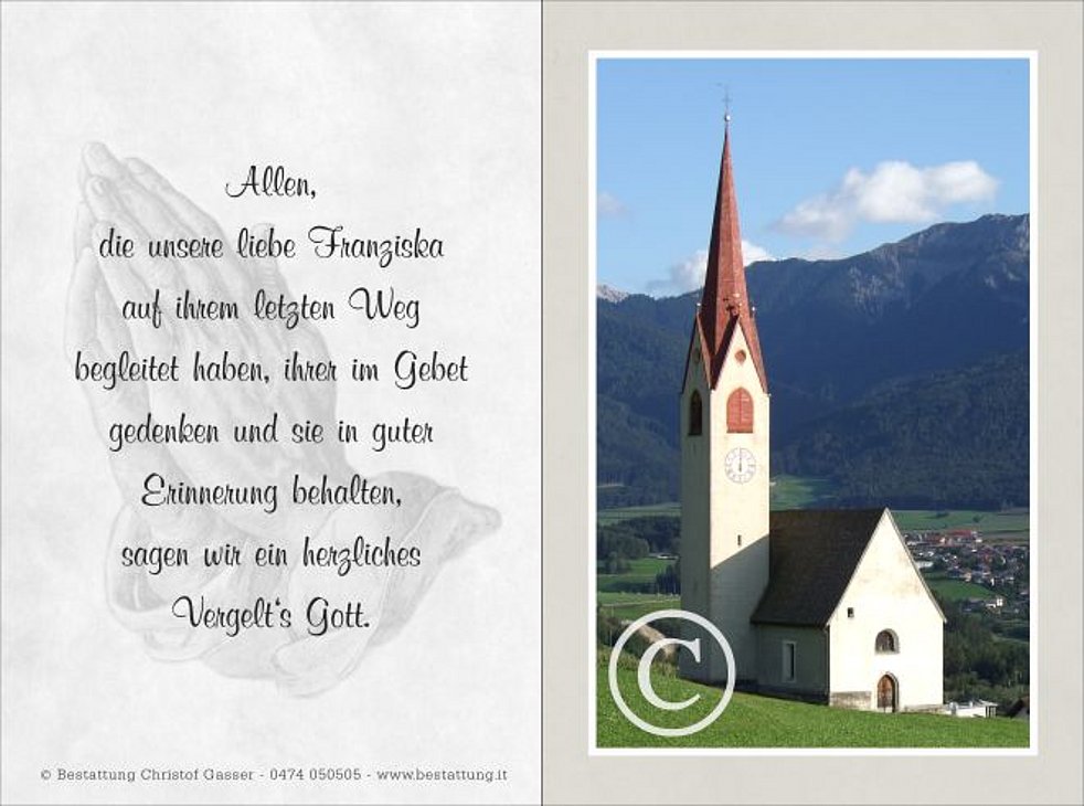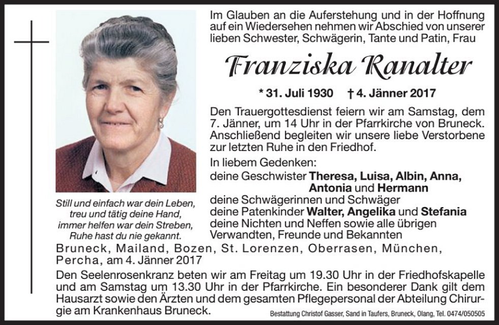 Den Trauergottesdienst feiern wir am Samstag, dem 7. Jänner, um 14 Uhr in der Pfarrkirche von Bruneck. Anschließend begleiten wir unsere liebe Verstorbene zur letzten Ruhe in den Friedhof.