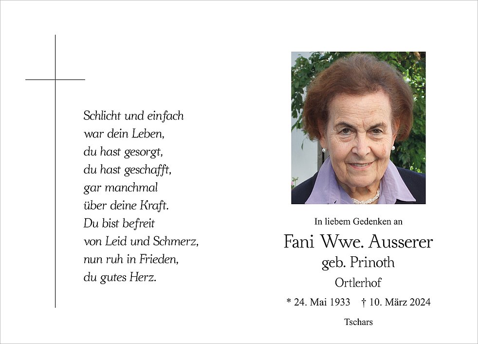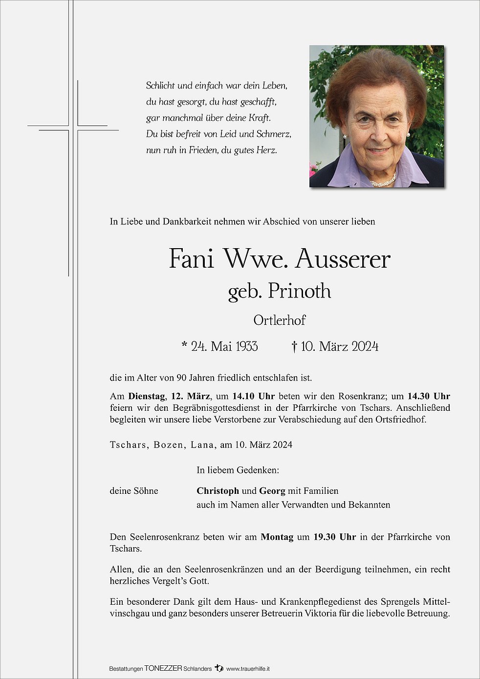 Am Dienstag, 12. März, um 14.10 Uhr beten wir den Rosenkranz; um 14.30 Uhr feiern wir den Begräbnisgottesdienst in der Pfarrkirche von Tschars.