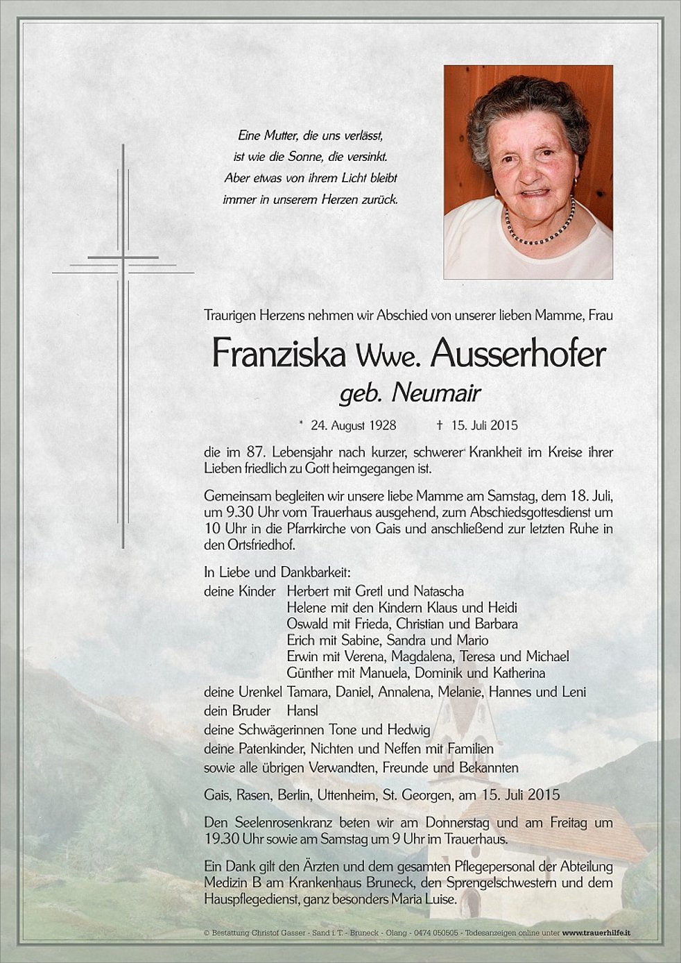 Gemeinsam begleiten wir unsere liebe Mamme am Samstag, dem 18. Juli, um 9.30 Uhr vom Trauerhaus ausgehend, zum Abschiedsgottesdienst um 10 Uhr in die Pfarrkirche von Gais und anschließend zur letzten Ruhe in den Ortsfriedhof.