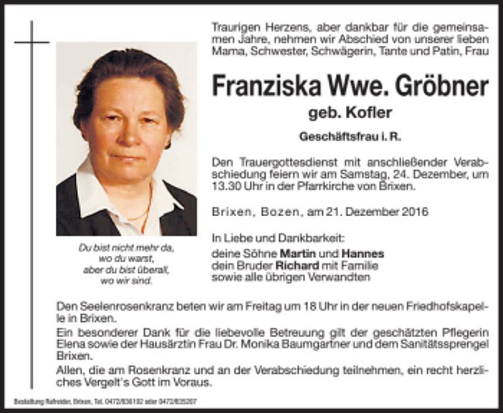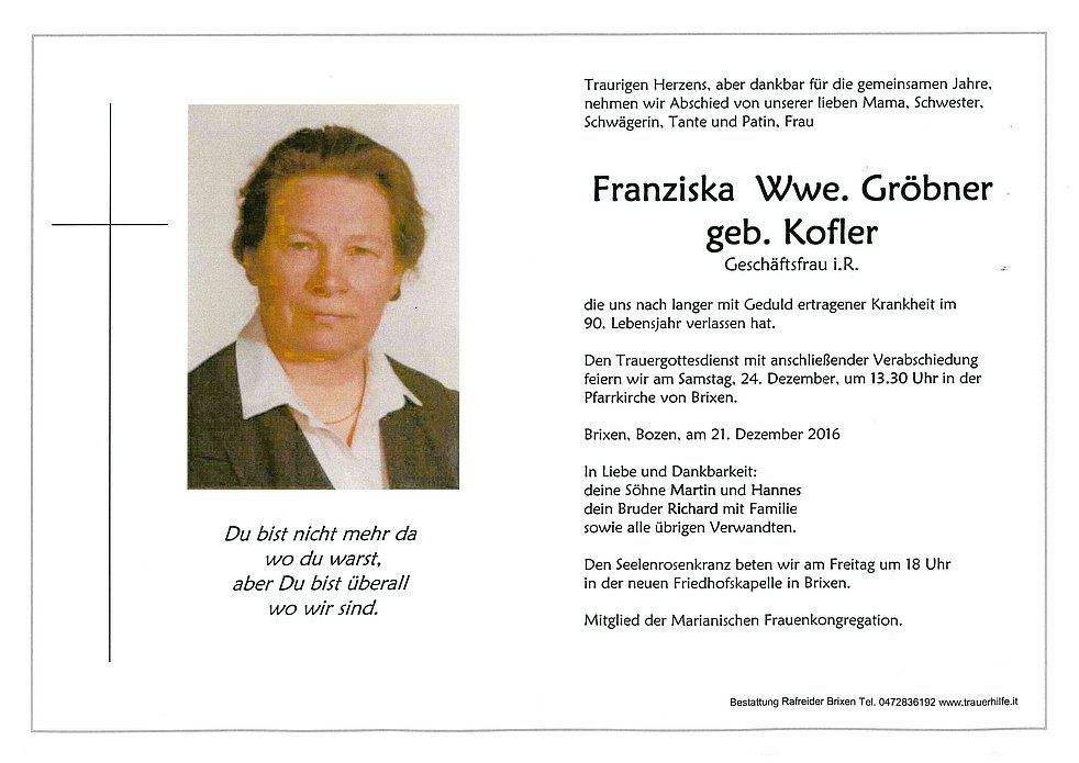 Den Trauergottesdienst mit anschließender Verabschiedung feiern wir am Samstag, 24. Dezember, um 13.30 Uhr in der Pfarrkirche von Brixen.