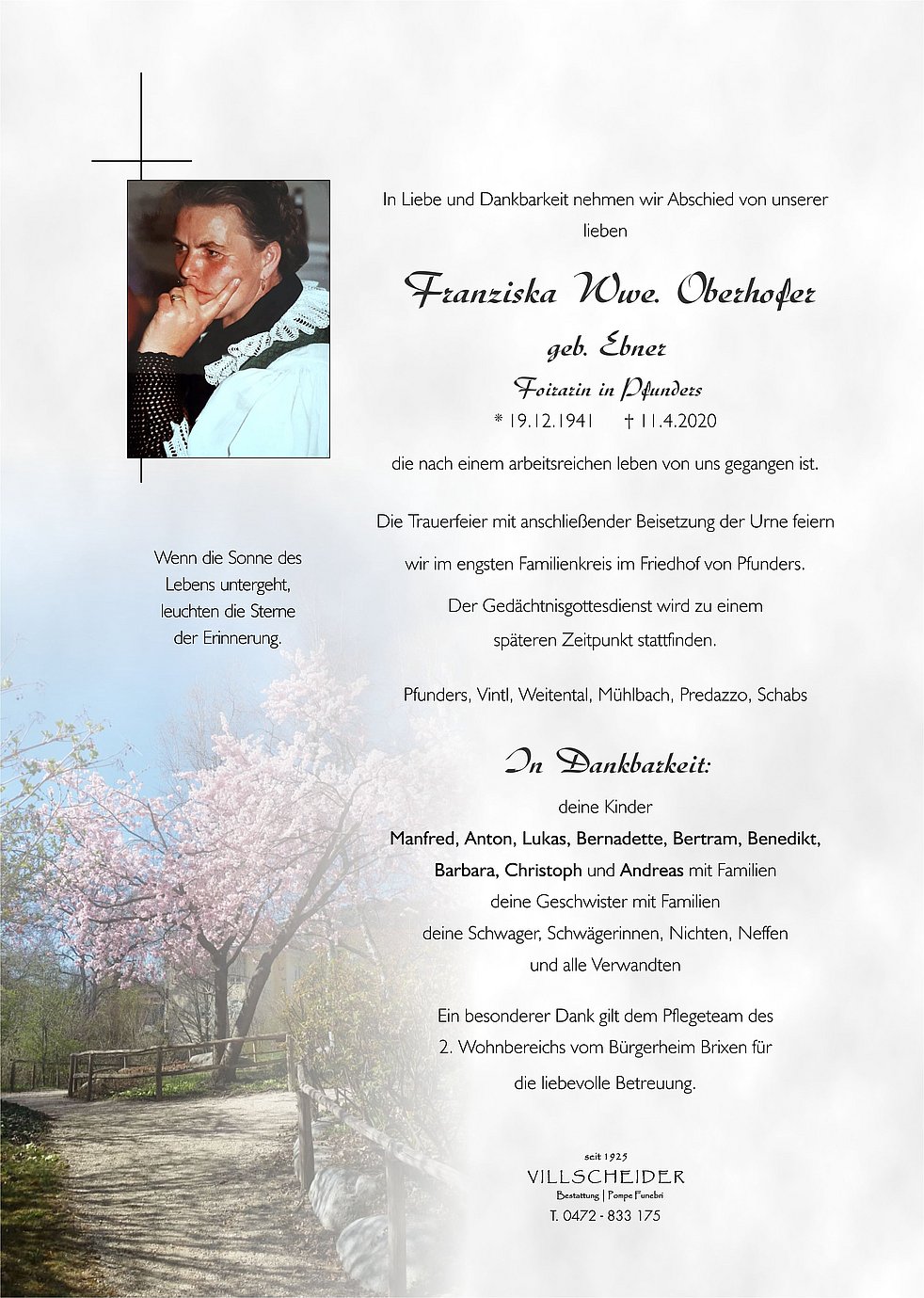 Die Trauerfeier mit anschließender Beisetzung der Urne feiern wir im engsten Familienkreis im Friedhof von Pfunders.
