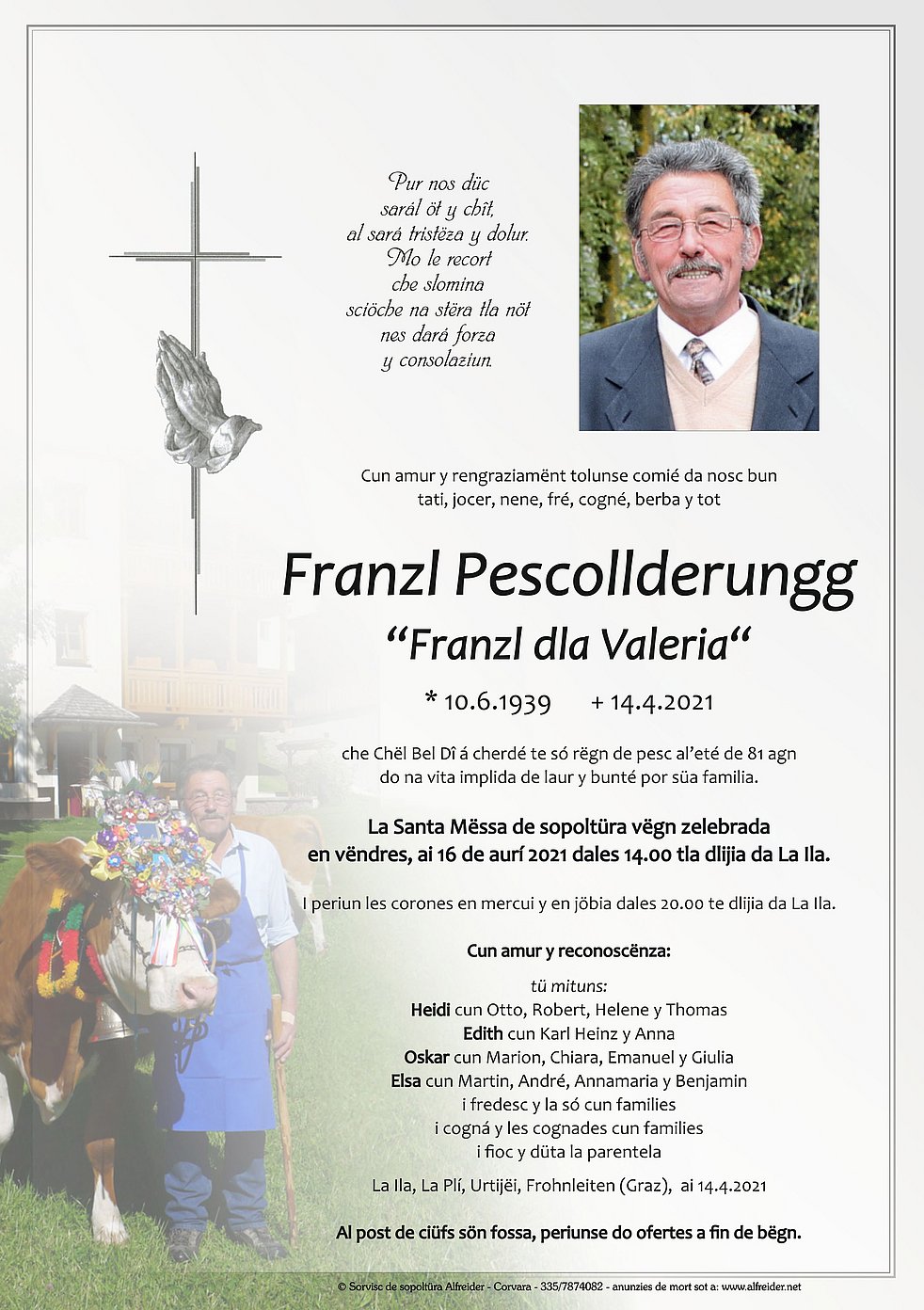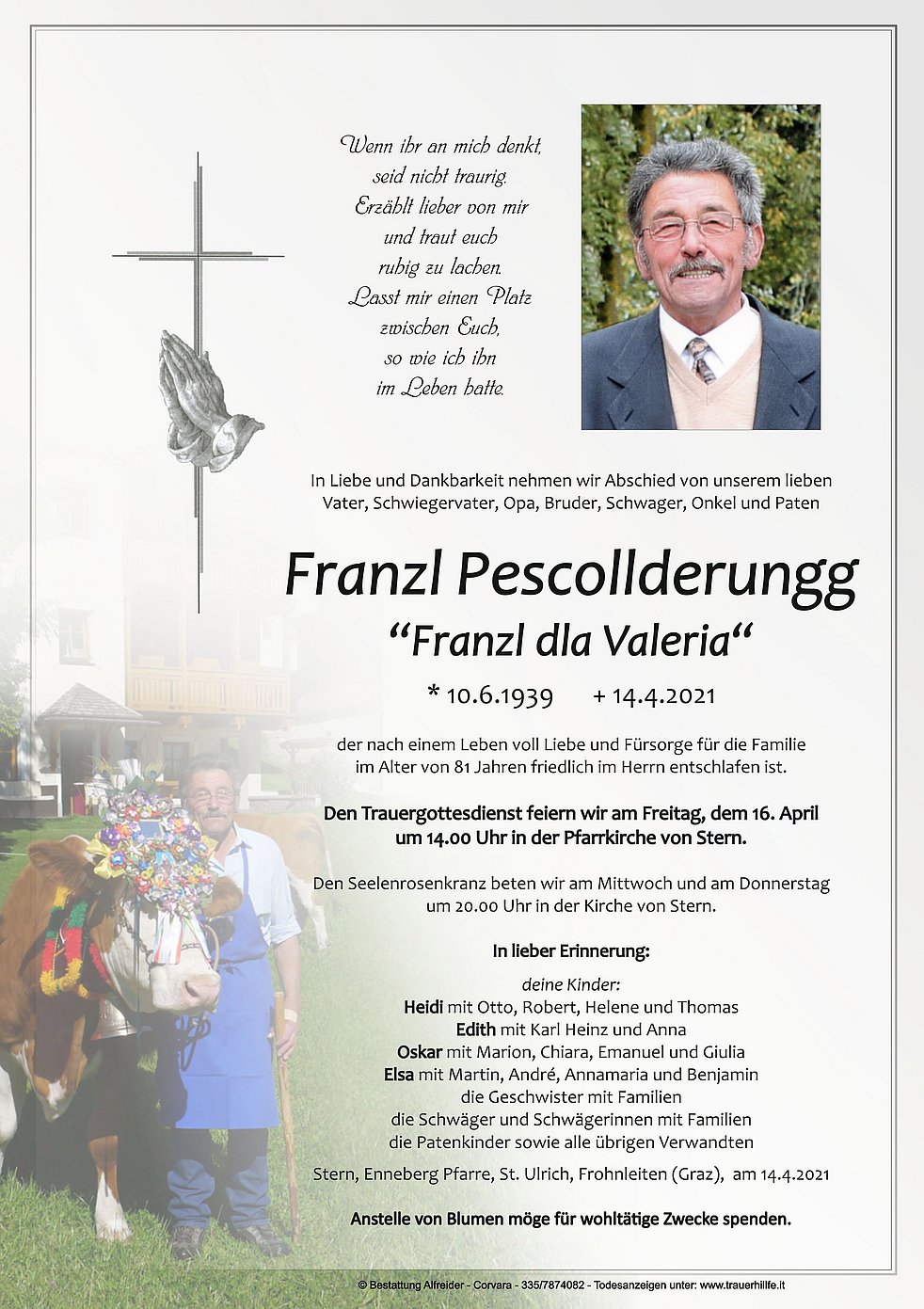 Den Trauergottesdienst feiern wir am Freitag, dem 16. April um 14.00 Uhr in der Pfarrkirche von Stern.