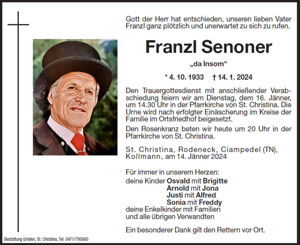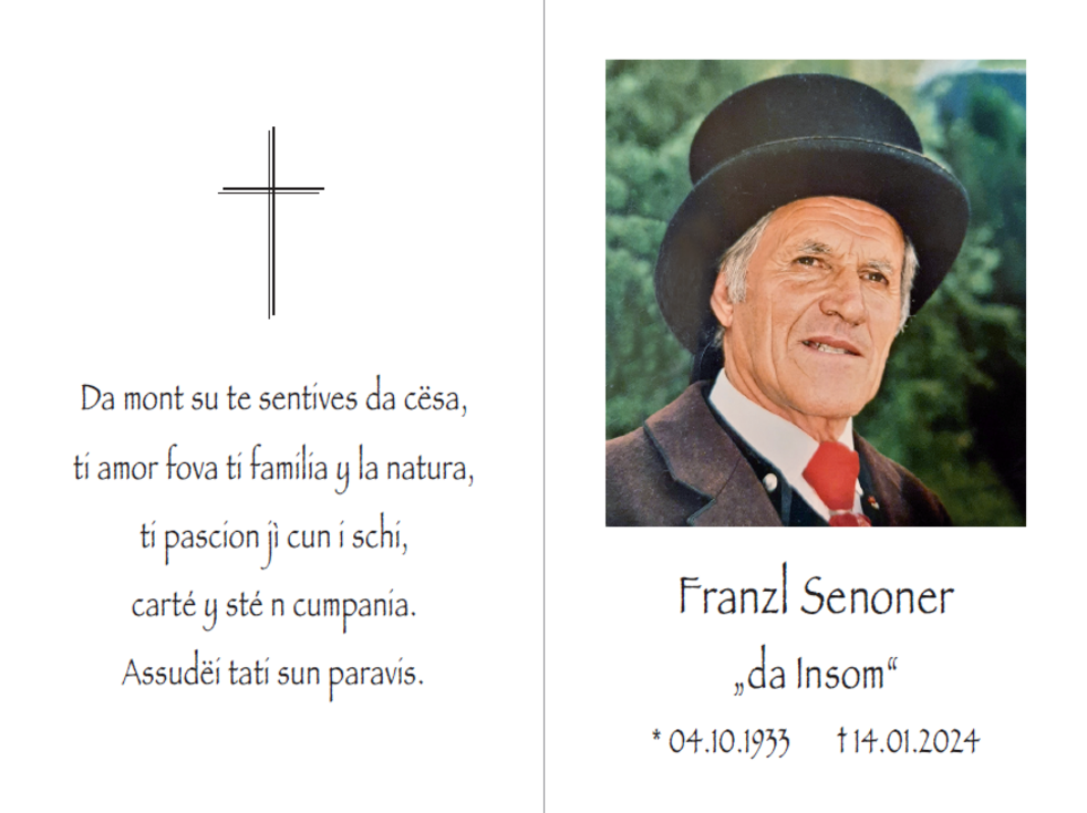 Den Trauergottesdienst mit anschließender Verabschiedung feiern wir am Dienstag, dem 16. Jänner, um 14.30 Uhr in der Pfarrkirche von St. Christina. Die Urne wird nach erfolgter Einäscherung im Kreise der Familie im Ortsfriedhof beigesetzt.