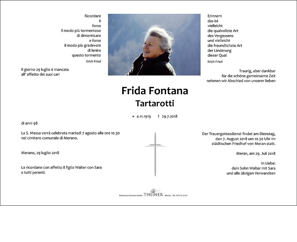 Der Trauergottesdienst findet am Dienstag, den 7. August 2018 um 10.30 Uhr im städtischen Friedhof von Meran statt.