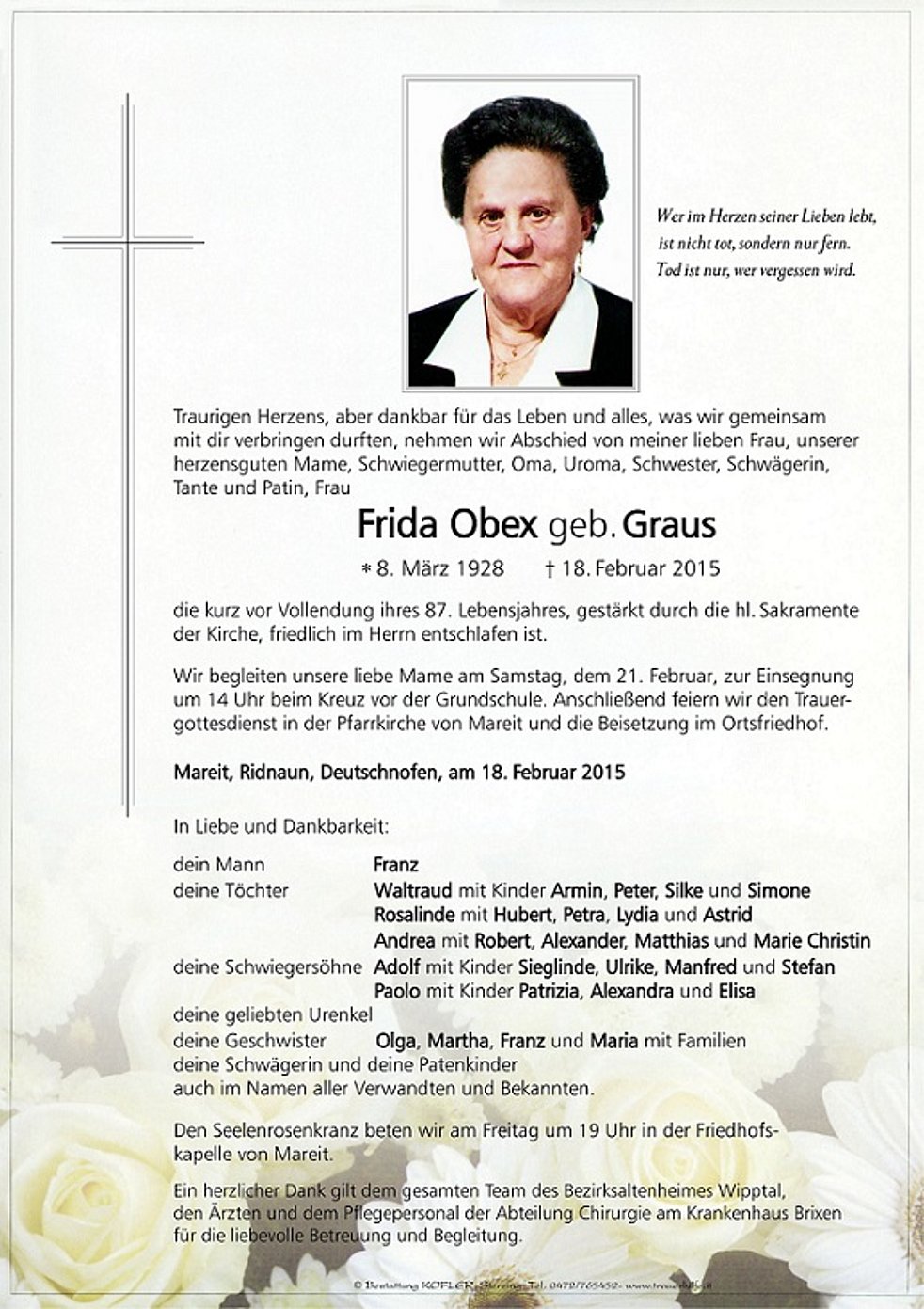 um 14 Uhr beim Kreuz vor der Grundschule. Anschließend feiern wir den Trauergottesdienst in der Pfarrkirche von Mareit und die Beisetzung im Ortsfriedhof.