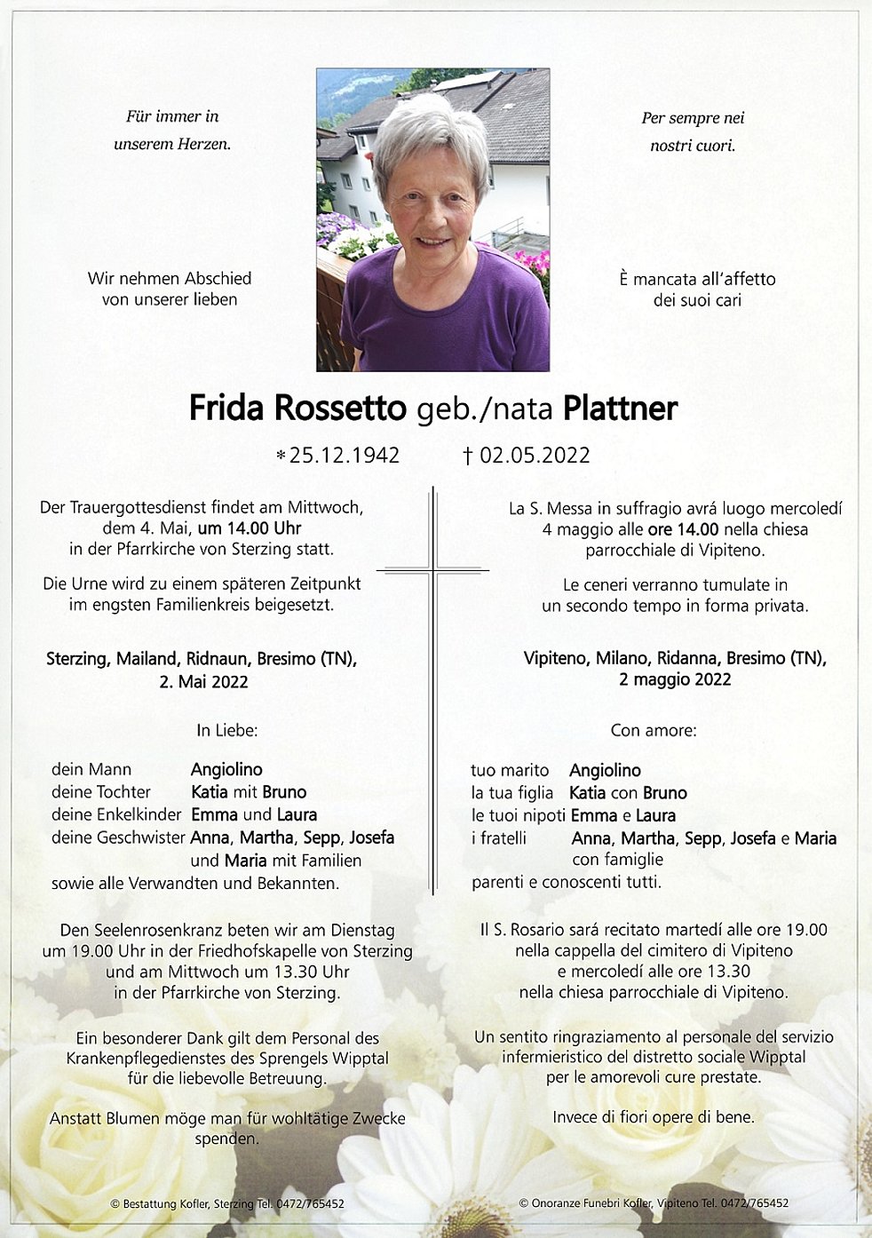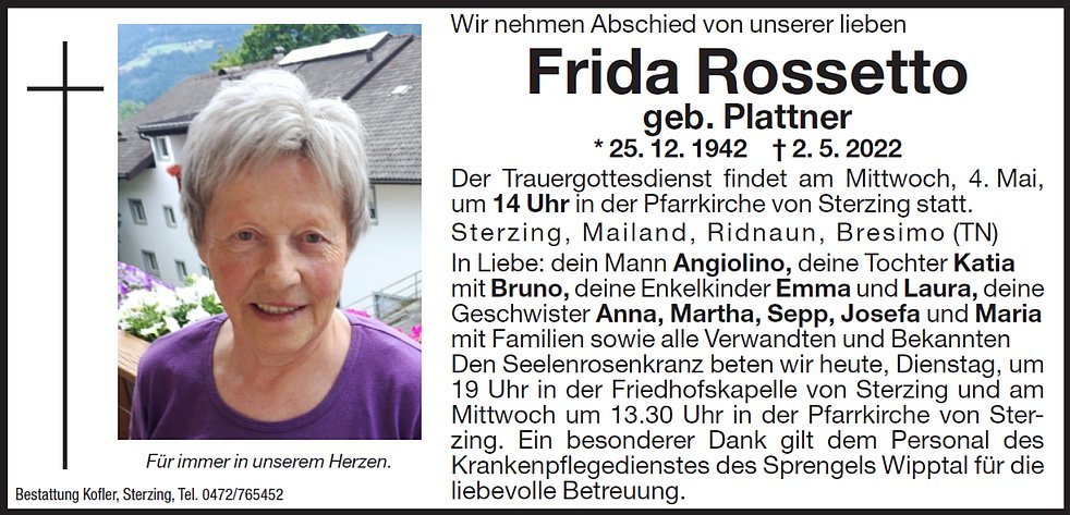 Der Trauergottesdienst findet am Mittwoch, dem 4. Mai, um 14.00 Uhr in der Pfarrkirche von Sterzing statt.