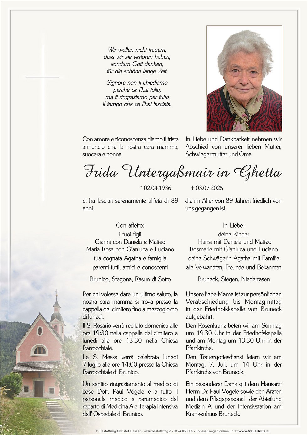 Den Trauergottesdienst feiern wir am Montag, 7. Juli, um 14 Uhr in der Pfarrkirche von Bruneck.
