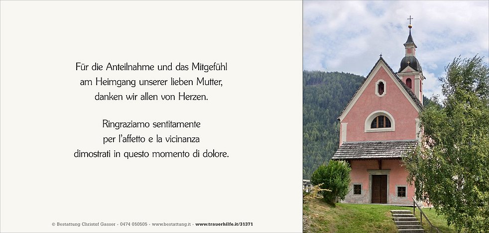 Unsere liebe Mama ist zur persönlichen Verabschiedung bis Montagmittag in der Friedhofskapelle von Bruneck aufgebahrt.