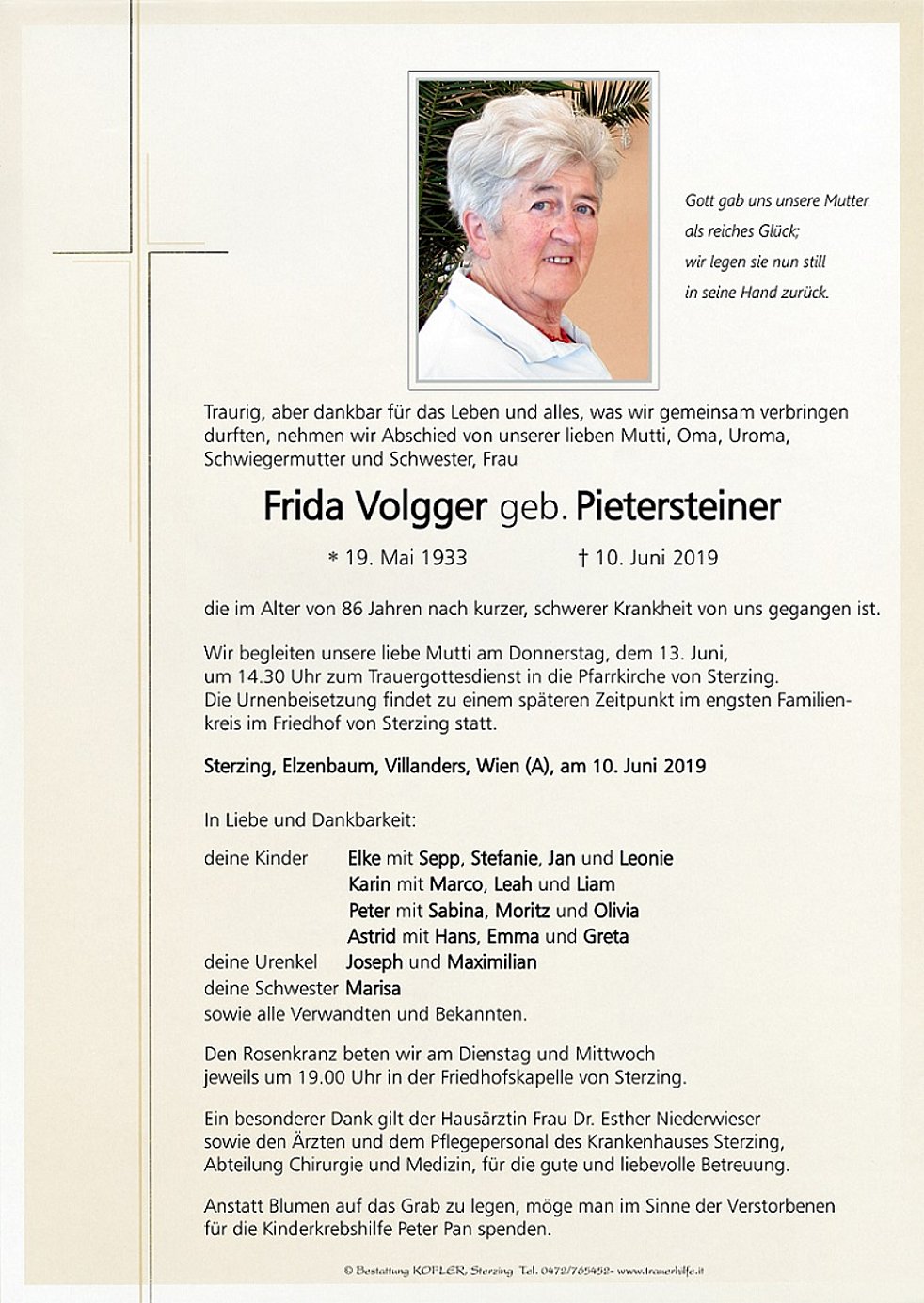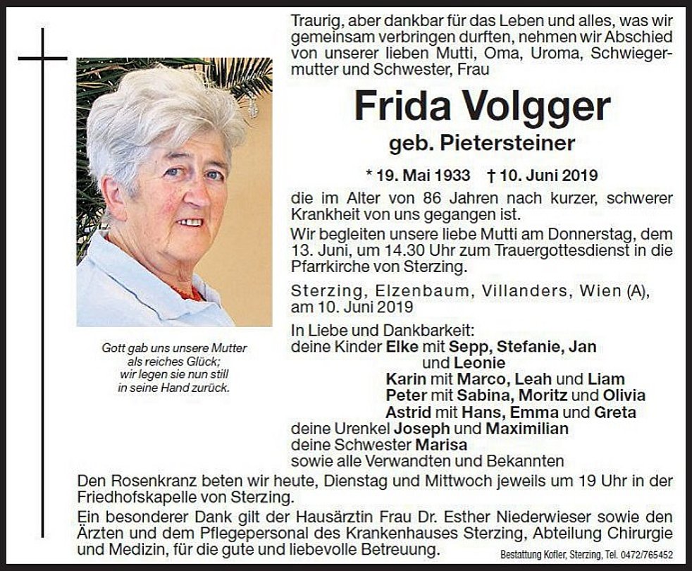 Wir begleiten unsere liebe Mutti am Donnerstag, dem 13. Juni, um 14.30 Uhr zum Trauergottesdienst in die Pfarrkirche von Sterzing.