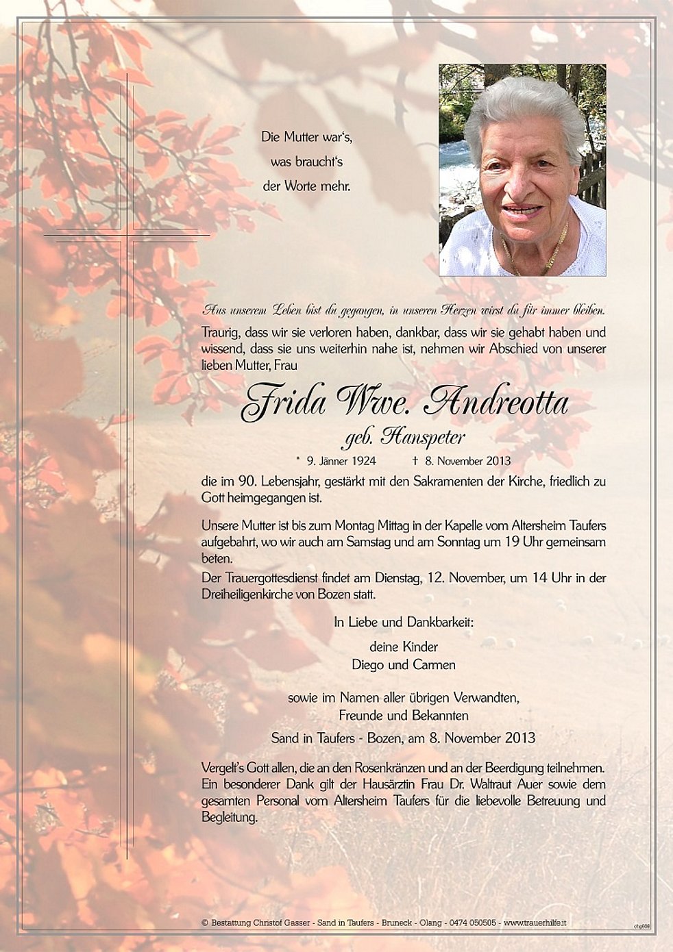 Ein besonderer Dank gilt der Hausärztin Frau Dr. Waltraut Auer sowie dem gesamten Personal vom Altersheim Taufers für die liebevolle Betreuung und Begleitung.