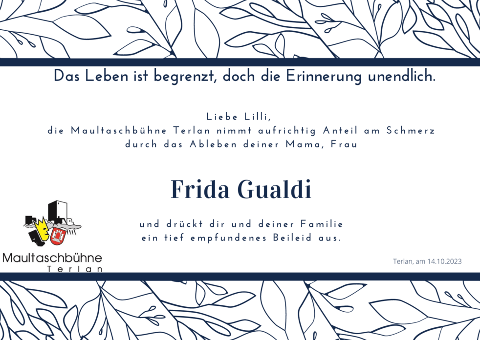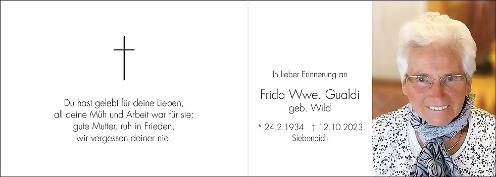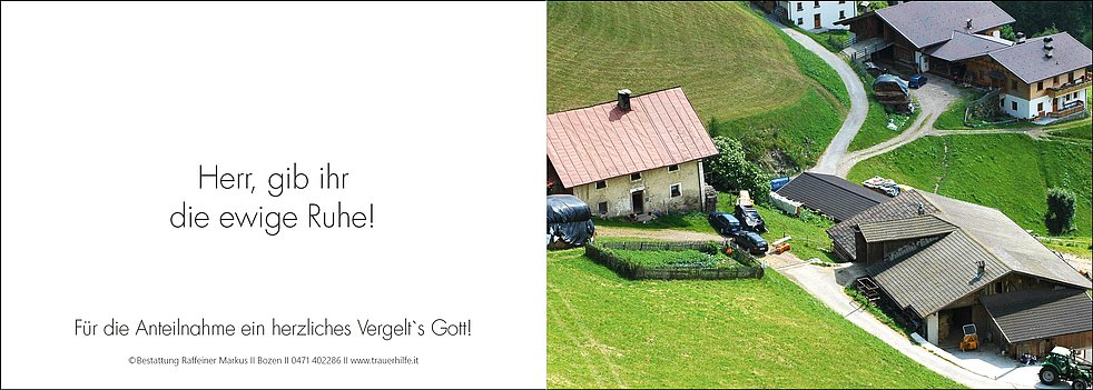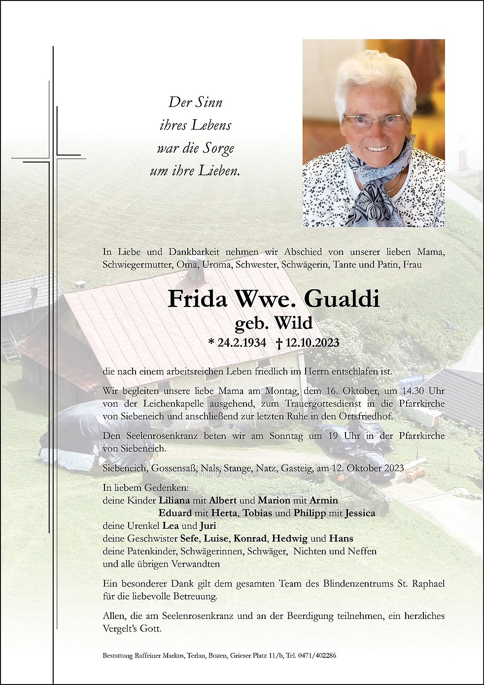 Wir begleiten unsere liebe Mama am Montag, dem 16. Oktober, um 14.30 Uhr von der Leichenkapelle ausgehend, zum Trauergottesdienst in die Pfarrkirche von Siebeneich und anschließend zur letzten Ruhe in den Ortsfriedhof.