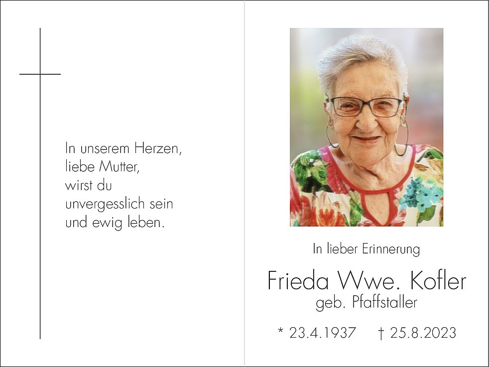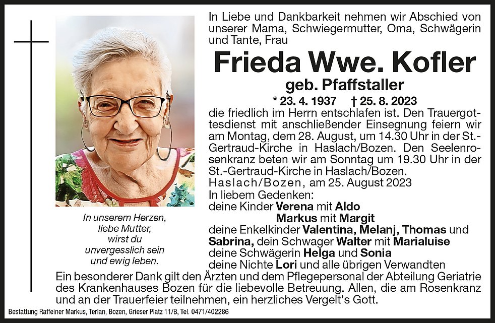 Den Trauergottesdienst mit anschließender Einsegnung feiern wir am Montag, dem 28. August, um 14.30 Uhr in der St. Gertraud-Kirche in Haslach/Bozen.