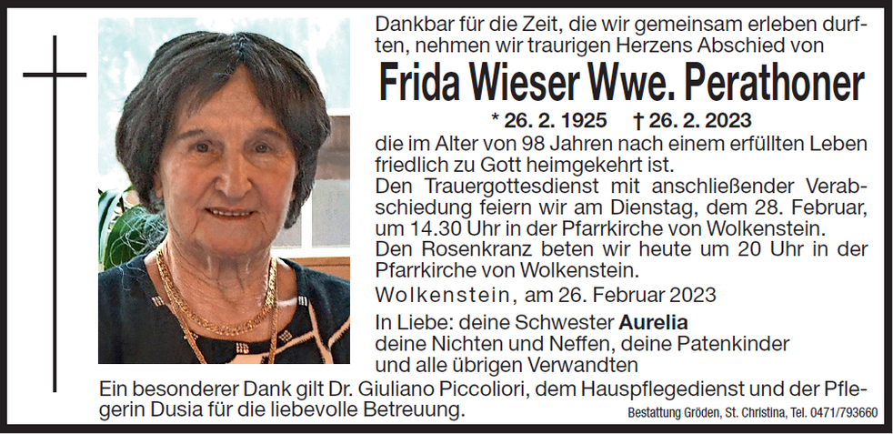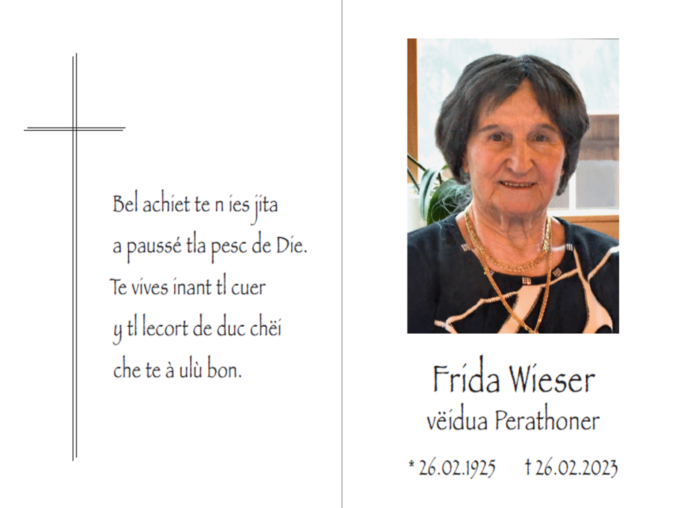 Den Trauergottesdienst mit anschließender Verabschiedung feiern wir am Dienstag, dem 28. Februar, um 14.30 Uhr in der Pfarrkirche von Wolkenstein.