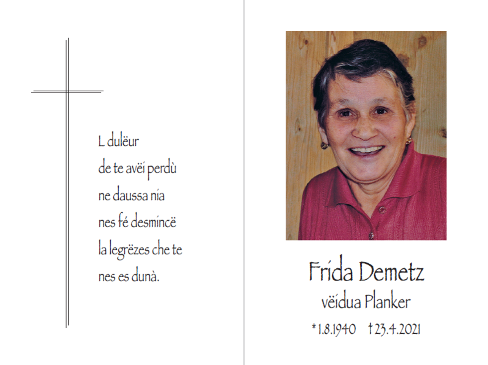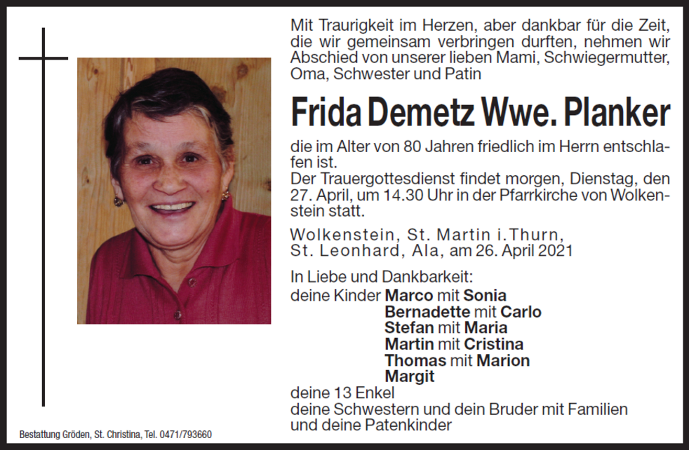 Der Trauergottesdienst findet am Dienstag, den 27. April, um 14:30 Uhr in der Pfarrkirche von Wolkenstein statt.