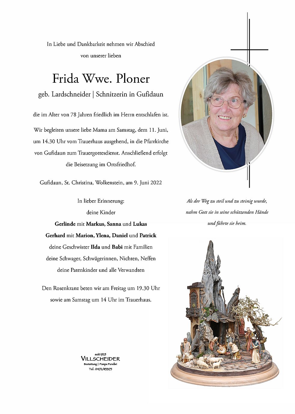 Liebe Gerlinde, lieber Gerhard mit Familie! Mein aufrichtiges Mitgefühl, wünsche euch viel Kraft in dieser schweren Zeit! Werde Frida als Nachbarin in lieber Erinnerung behalten und ihrer im Gebet gedenken.