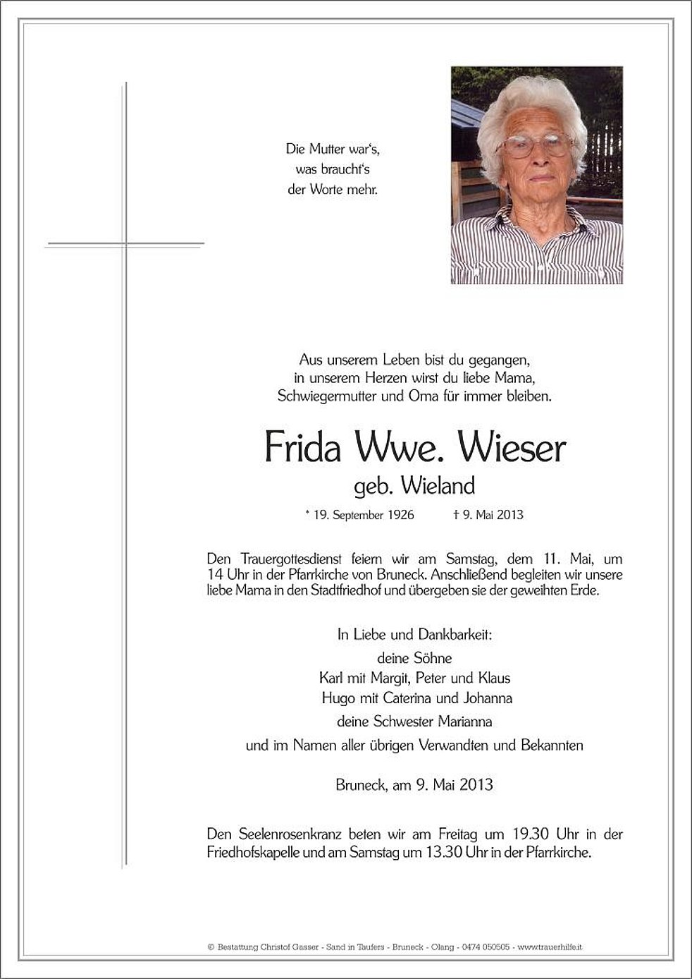 14 Uhr in der Pfarrkirche von Bruneck. Anschließend begleiten wir unsere liebe Mama in den Stadtfriedhof und übergeben sie der geweihten Erde.