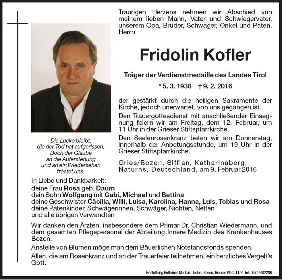 Den Trauergottesdienst mit anschlieβender Einsegnung feiern wir am Freitag, dem 12. Februar, um 11 Uhr in der Grieser Stiftspfarrkirche.